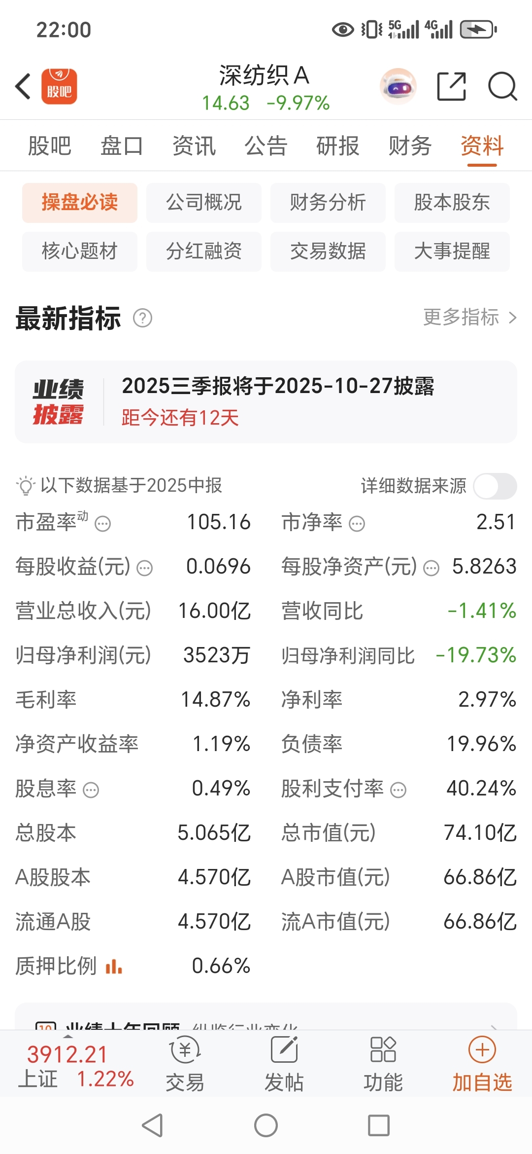 深纺织是中小盘,净资产只有5.8*4.57=26.506亿元!