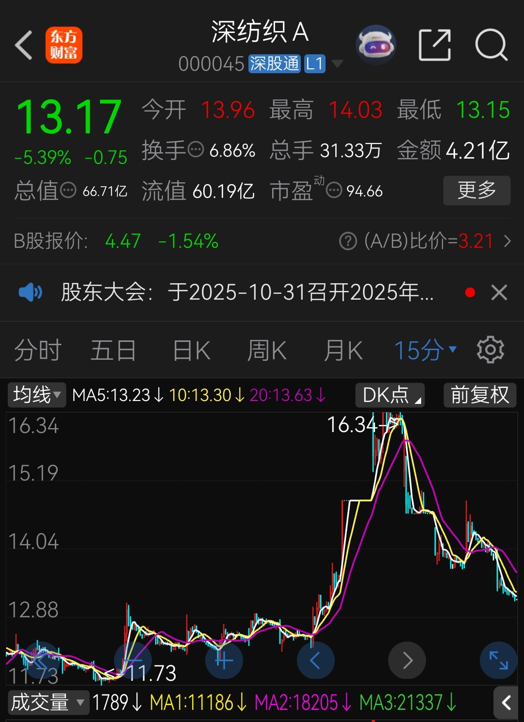 $深纺织A(SZ000045)$ 30分钟线,岌岌可危,或者是破位在即