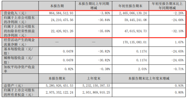其中,第三季度,公司营业收入为8.65亿元,同比下降3.80%;归母净利润为2421.05万元,同比下降30.84%;扣非归母净利润为2242.69万元,同比下降35.69%。