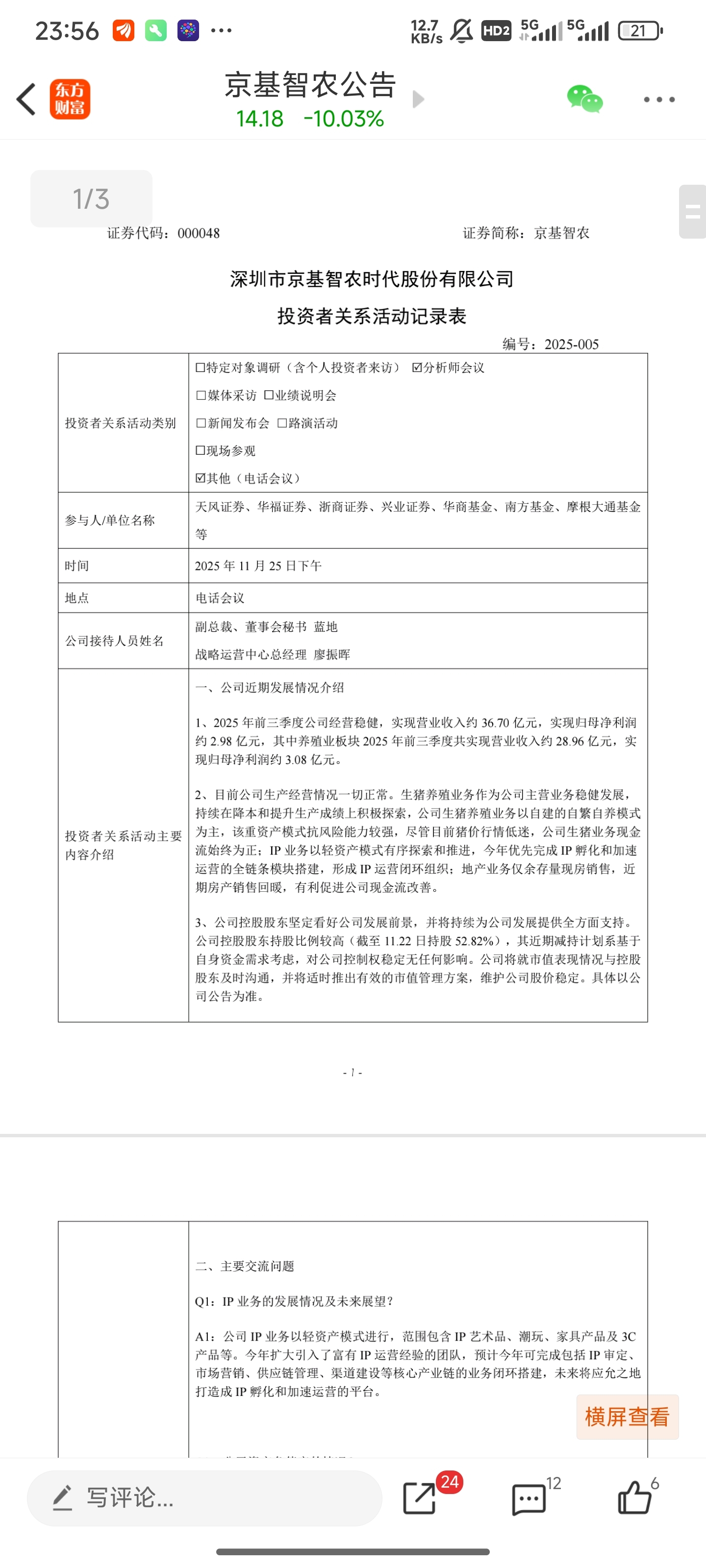 $京基智农(SZ000048)$ $航天发展(SZ000547)$ $合富中国(SH603122)$ 京基智农,金鸡之龙??今天是啥情况?还以为有雷了,明天可以低开抄底了。这是要翻倍的股。。