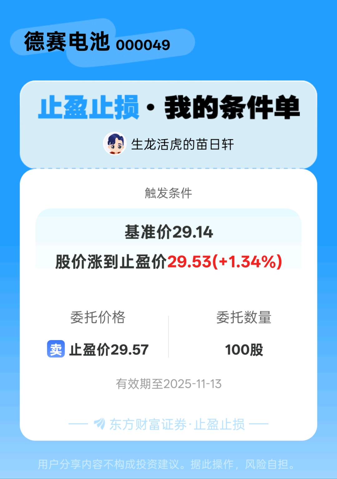 #条件单交流# #止盈止损晒单# 一位股神设置了一个止盈止损条件单,接下来就是见证奇迹的时刻~$德赛电池(SZ000049)$