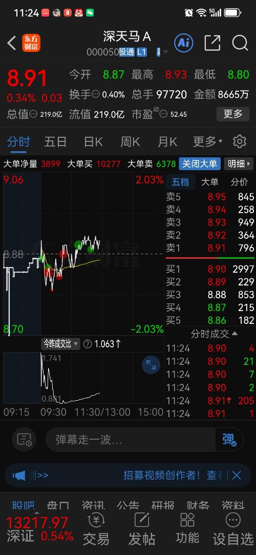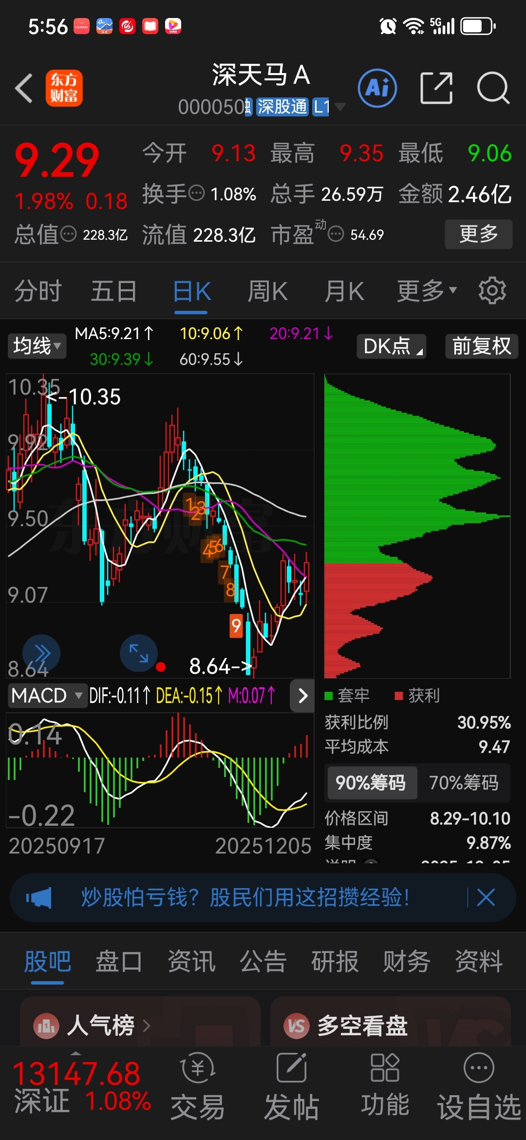 A2025.12.05日(星期五)农历十月十六,继续跟踪低估低价潜力科技个股000050《深天马A》该股属于行业龙头企业,今日动态收盘现价:9.29元,对应净资产11.193元(破净股之一)。短期已收复站在日MA5日10日20日均线之上,目前