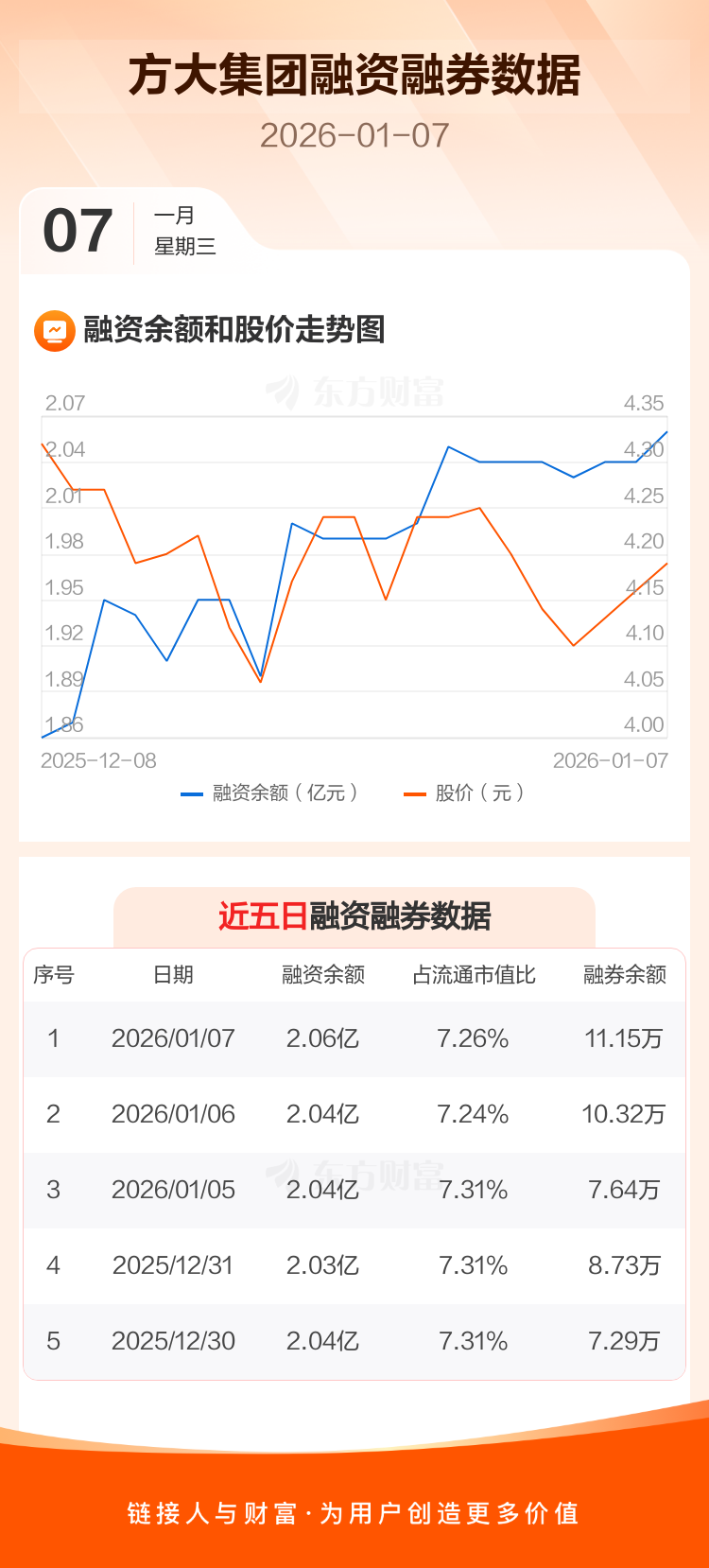 交易所最新数据显示,方大集团于2026年1月7日获融资买入824.42万元,融资偿还620.99万元,当日融资净买入203.43万元。目前,该股融资余额2.06亿,占流通市值比例为7.26%。