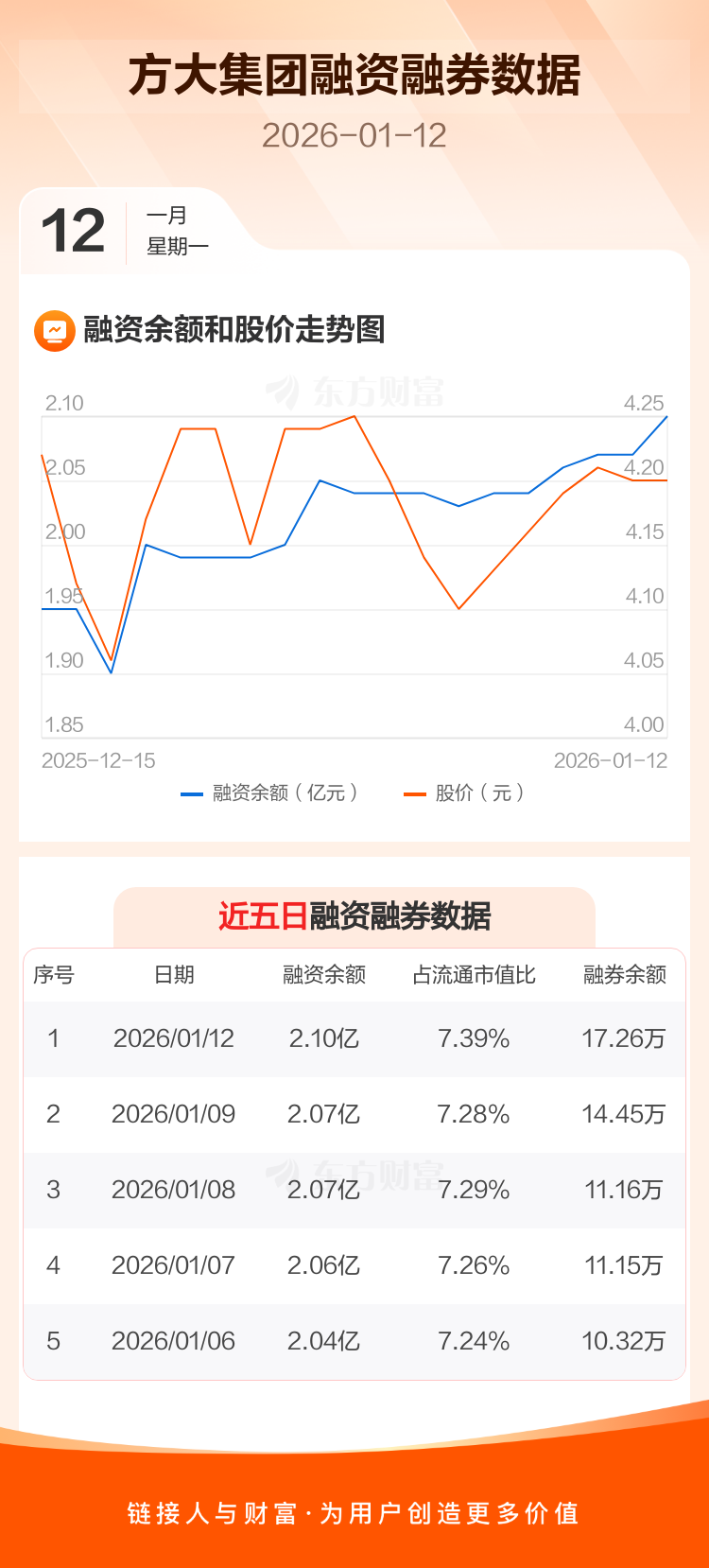 交易所最新数据显示,方大集团于2026年1月12日获融资买入1142.80万元,融资偿还833.60万元,当日融资净买入309.2万元。目前,该股融资余额2.10亿,占流通市值比例为7.39%。