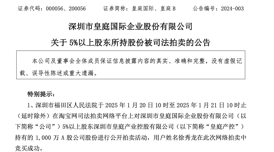 1月21日,深圳市皇庭国际企业股份有限公司(以下简称“皇庭国际”或“公司”)发布关于5%以上股东所持股份被司法拍卖的公告。深圳市福田区人民法院于2025年1月20日10时至2025年1月21日10时止(延时除外)在淘宝网司法拍卖网络平台上对皇庭国际5%以上股东深圳市皇庭产业控股有限公司(以下简称“皇庭产控”)持有的1,000万A股公司股份进行公开拍卖活动,用户姓名徐秀龙在此次网络拍卖中竞买成功。