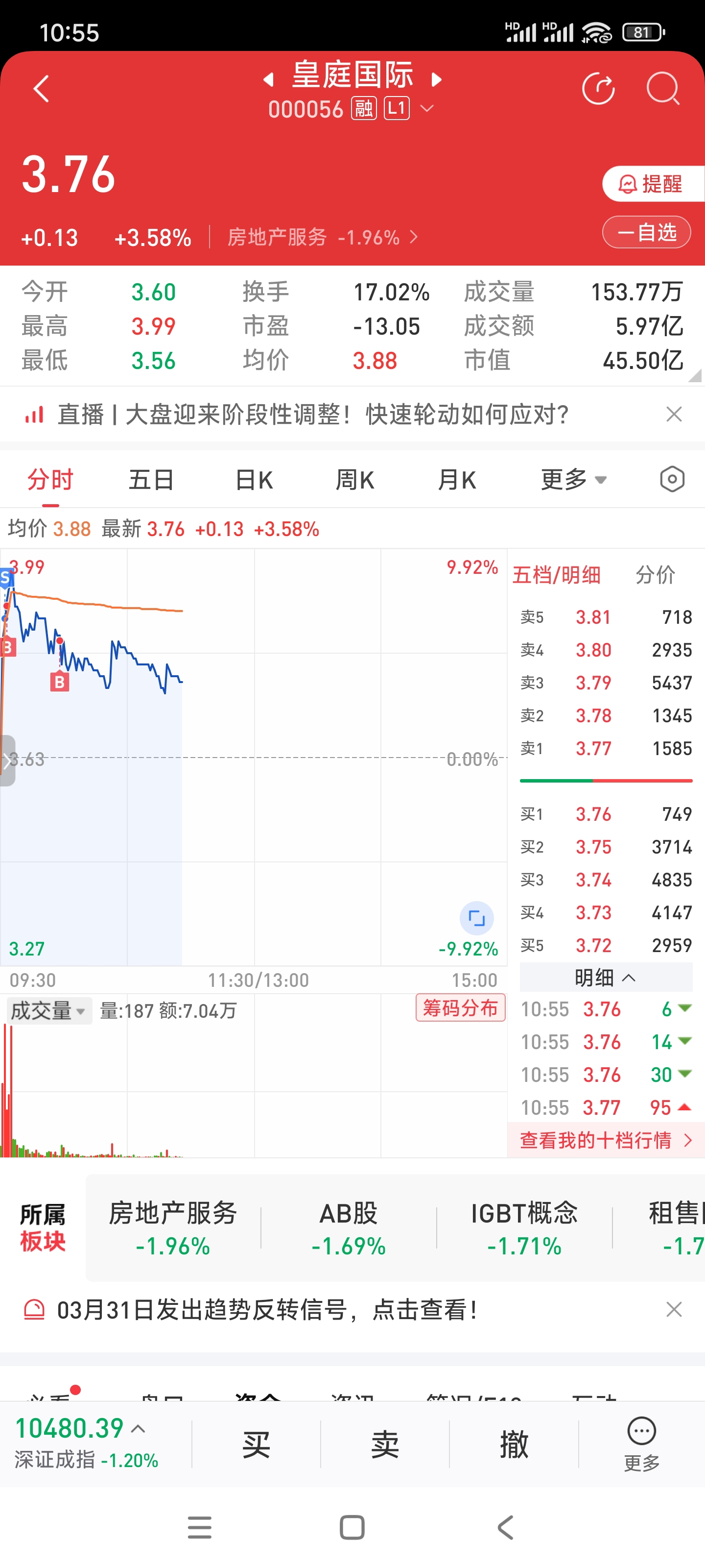 $皇庭国际(SZ000056)$ 实盘涨停板出,分两次买回。