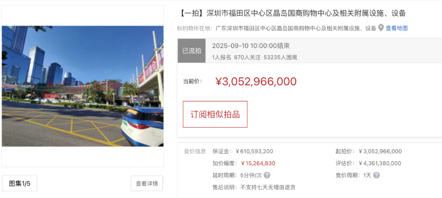 直至此次,光耀夏岚向法院申请以融发投资名下位于深圳市福田区中心区的晶岛国商购物中心(即深圳皇庭广场)及相关附属设施、设备被司法裁定以第一次网络拍卖起拍价305296.6万元抵偿相关债务。