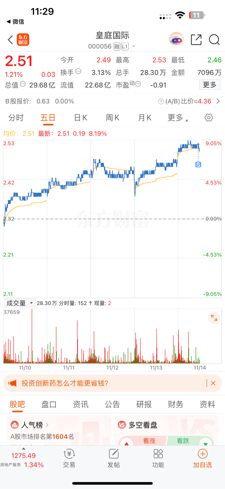 $皇庭国际(SZ000056)$ 一周9个点,落袋为安了#炒股日记# #复盘记录# #强势机会# #股市怎么看#
