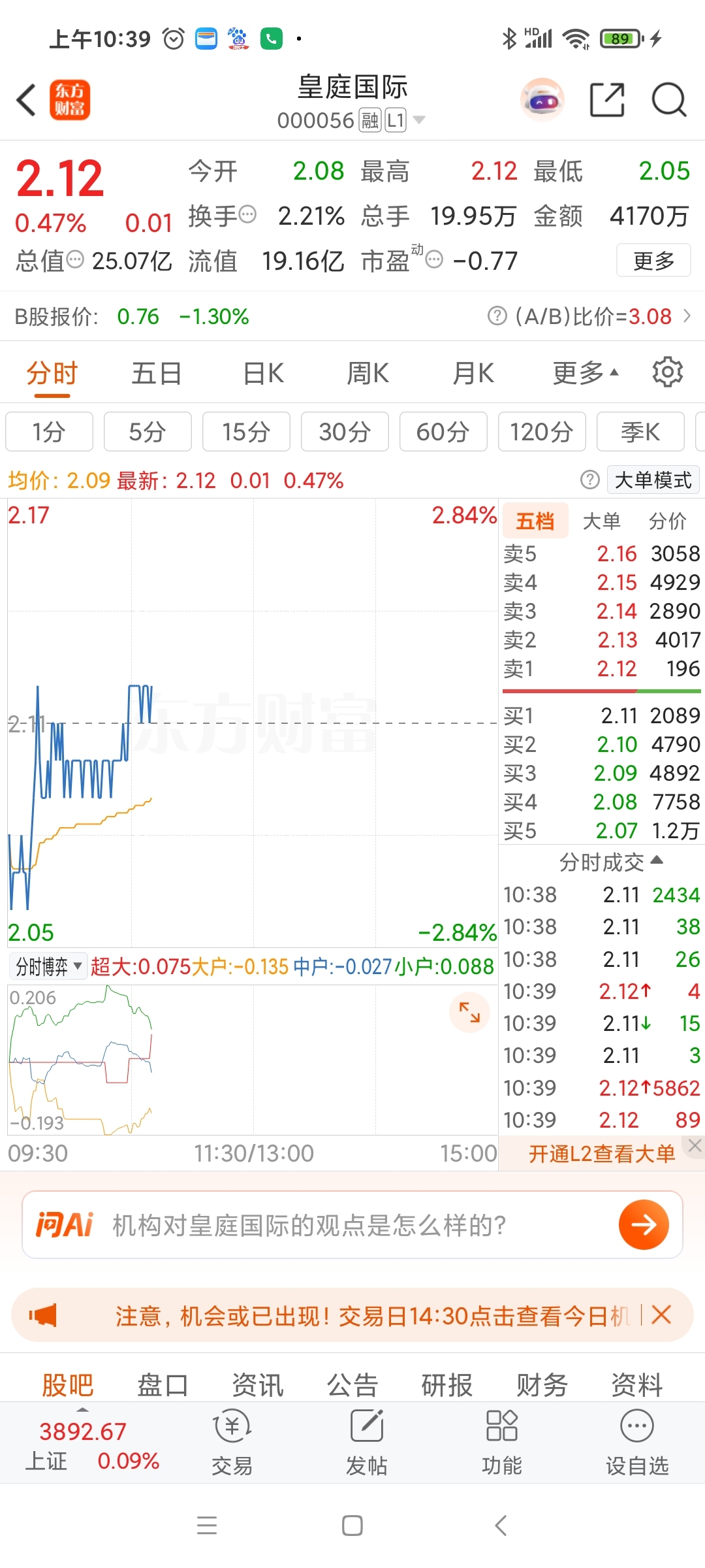 $皇庭国际(SZ000056)$ 主力大手笔,涨停