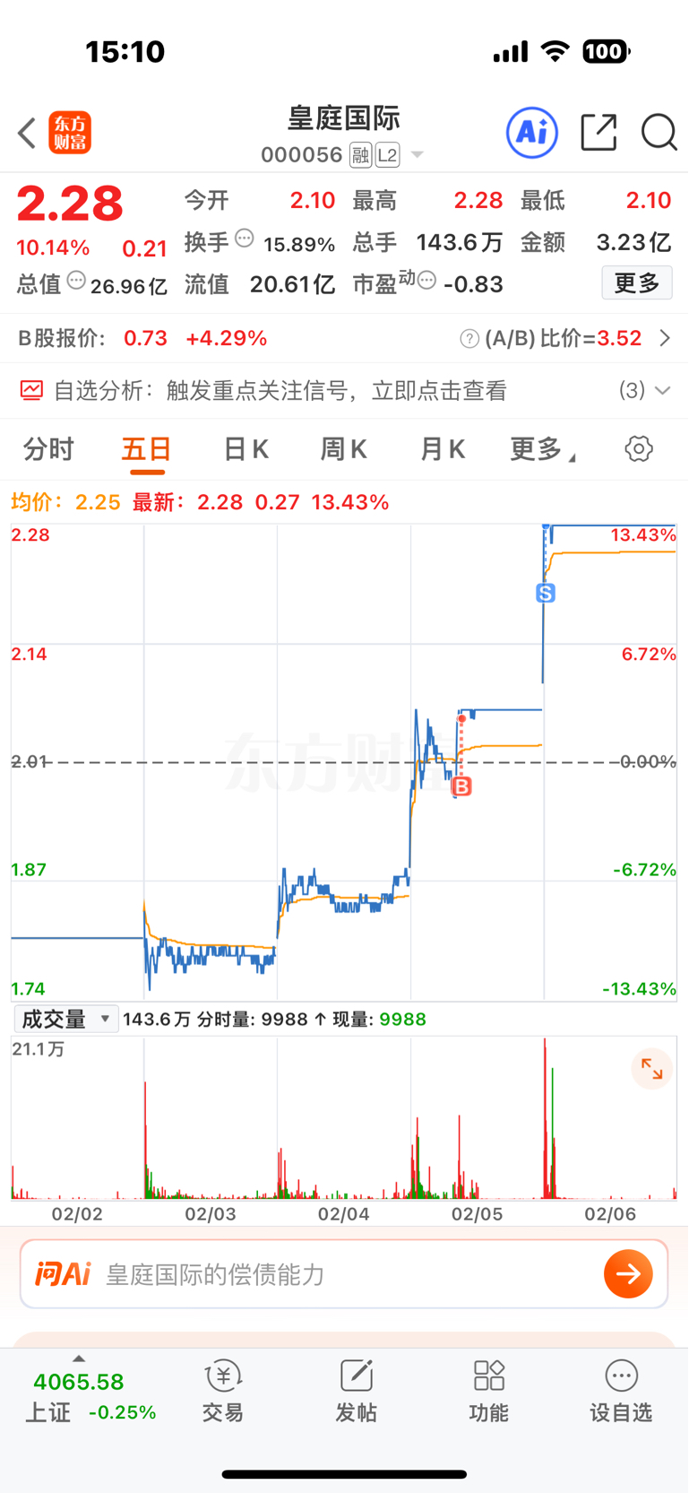 $皇庭国际(SZ000056)$ 下周不要一字板开 ,让我接回来,上班设置的涨停卖,哎卖飞了