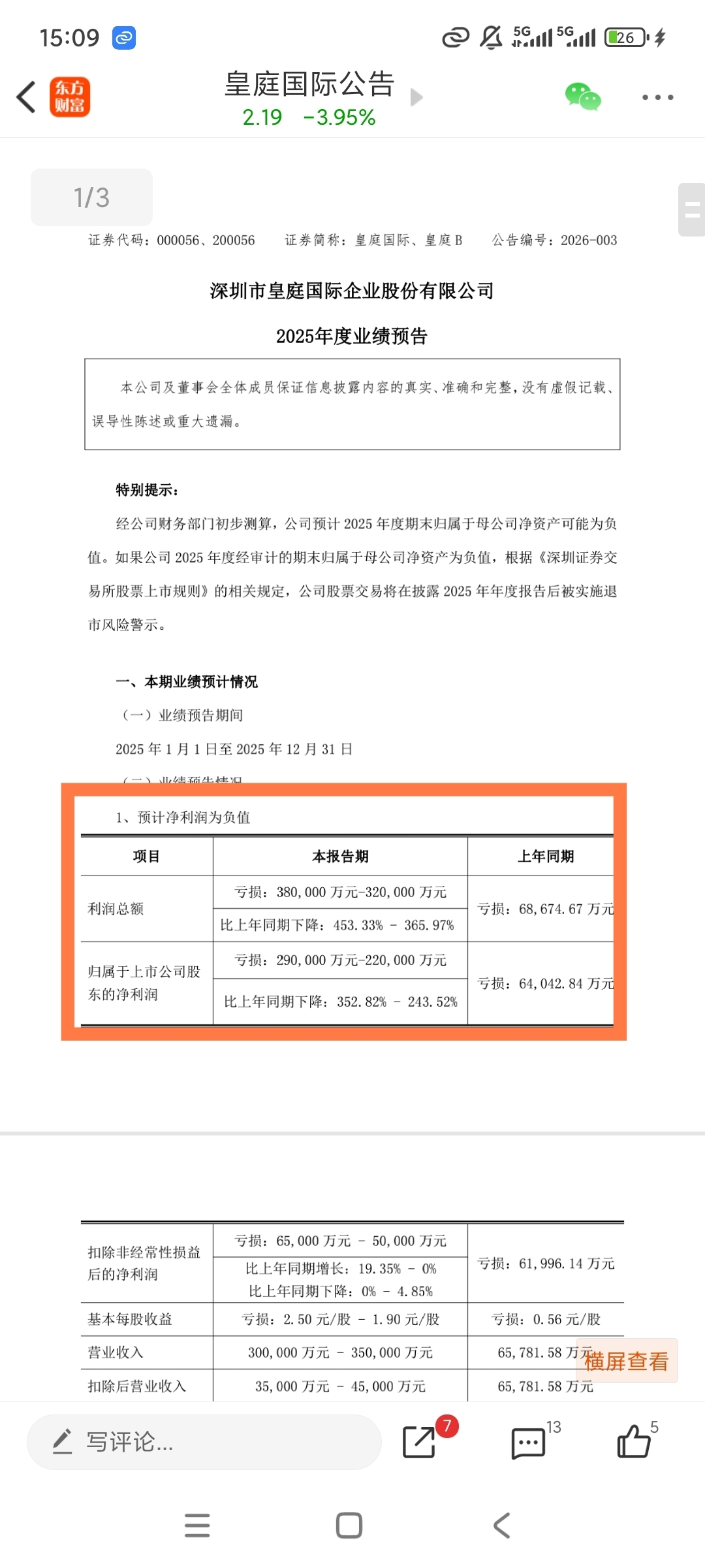 $皇庭国际(SZ000056)$ 连续亏损,资不抵债,马上退市