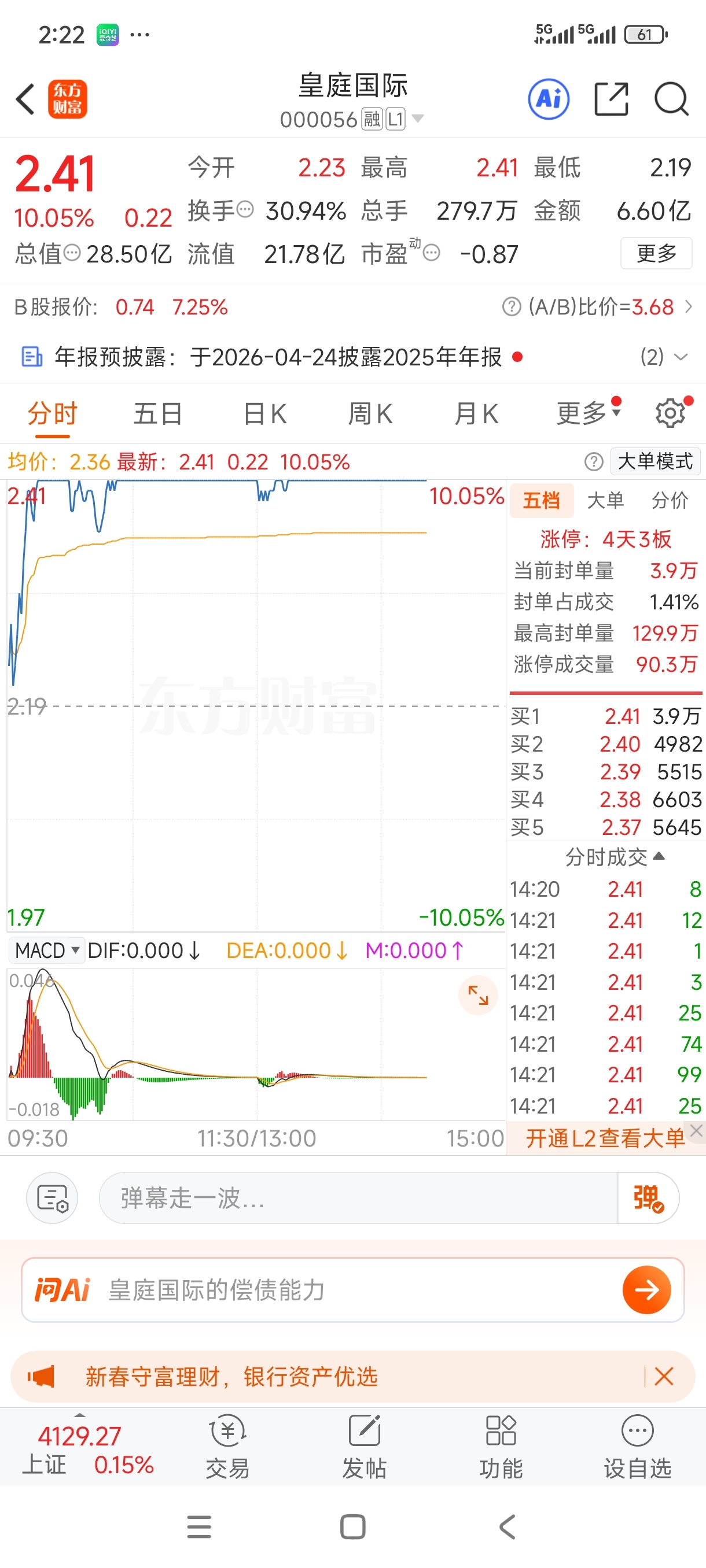 如果今天收盘,能以这区区几万手封住的话,感觉主力在吃独食,明天应该是一字板,最起