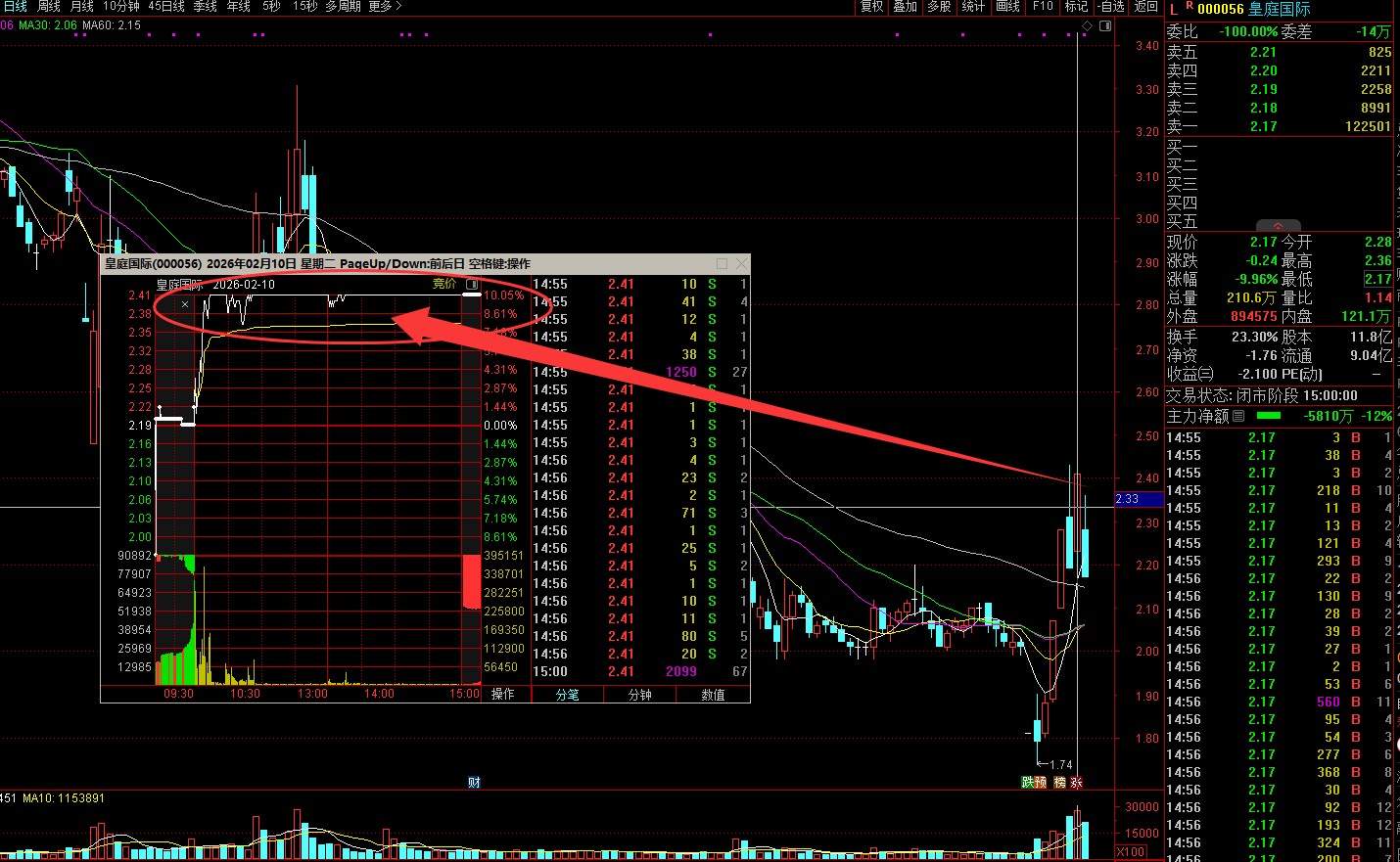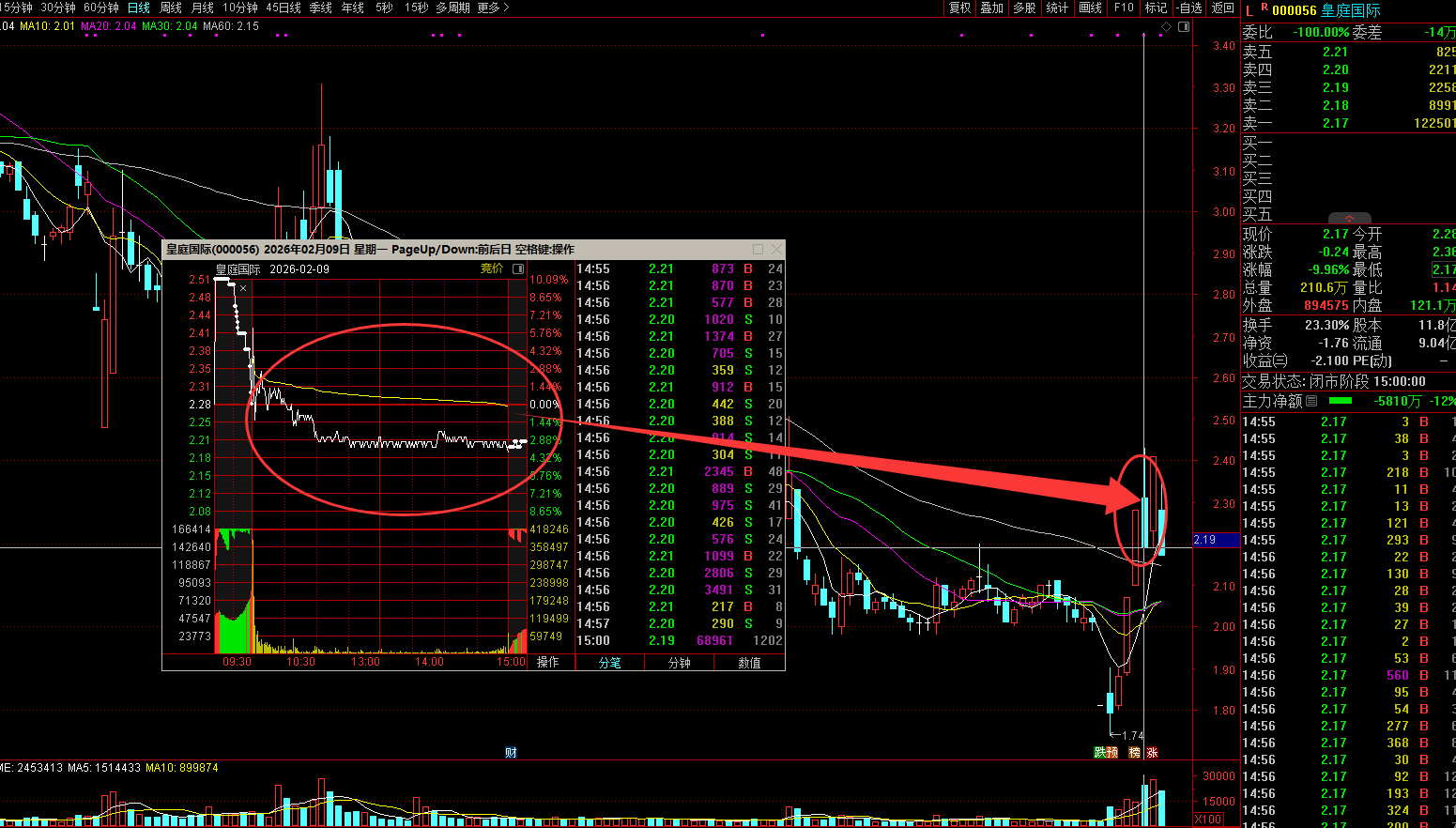 前天的这根K线分时图走势,就可以看出其实没有什么抛压,昨天主力为什么在涨停板上不断的反复开板?我预判是:没抛压的情况下,主力就想办法在涨停板上诱多短线打板资金,今天的跌停是让这些打板资金割肉出来,这样才有抛盘卖盘,主力才能吃到割肉盘