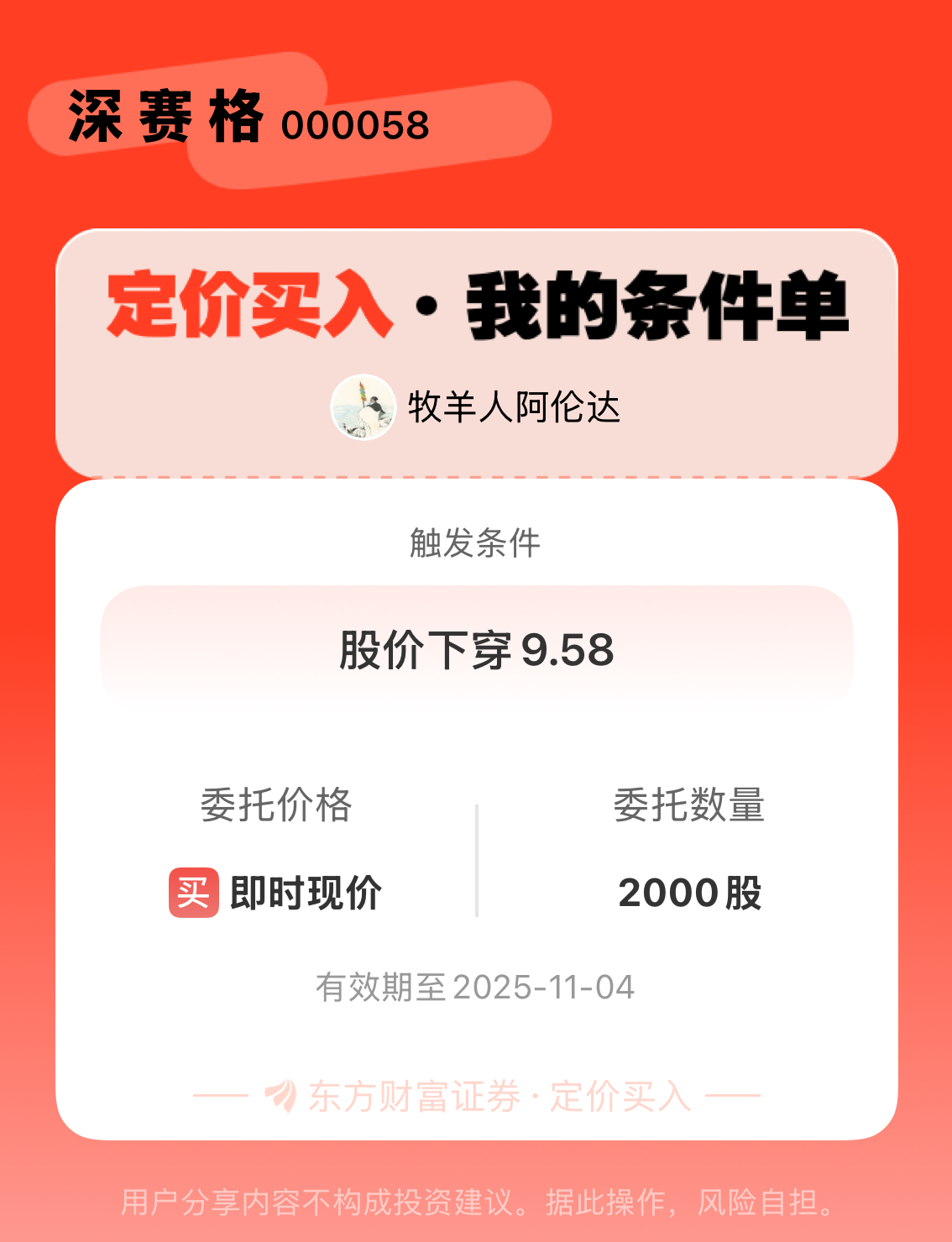 #条件单交流# #定价买入晒单# 一位股神设置了一个定价买入条件单,接下来就是见证奇迹的时刻~$深 赛 格(SZ000058)$