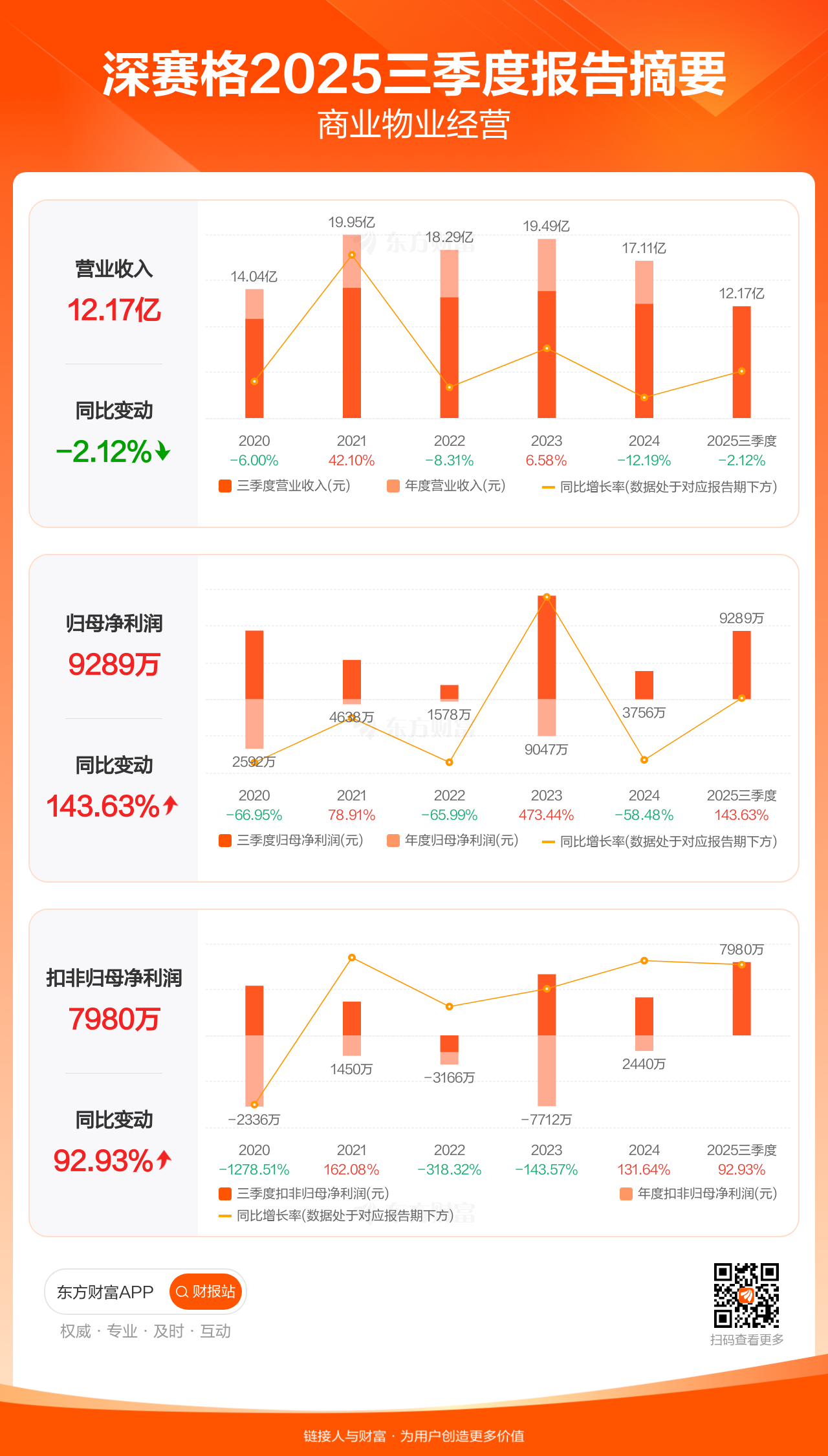 深赛格10月30日发布2025年三季报显示,公司前三季实现营业收入12.17亿元,同比下滑2.12%;归母净利润9288.65万元,同比增长143.63%;扣非归母净利润7980.28万元,同比增长92.93%。