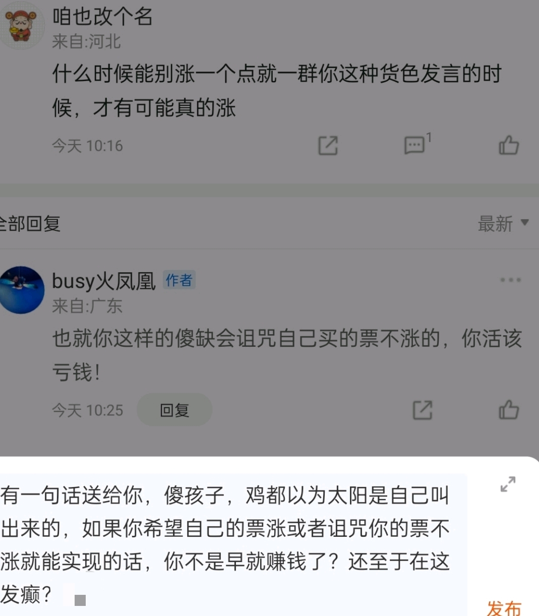 温馨提示: 1.根据《证券法》规定,禁止编造、传播虚假信息或者误导性信息,扰乱证券市场;2.用户在本社区发表的所有资料、言论等仅代表个人观点,与本网站立场无关,不对您构成任何投资建议。用户应基于自己的独立判断,自行决定证券投资并承担相应风险。《东方财富社区管理规定》