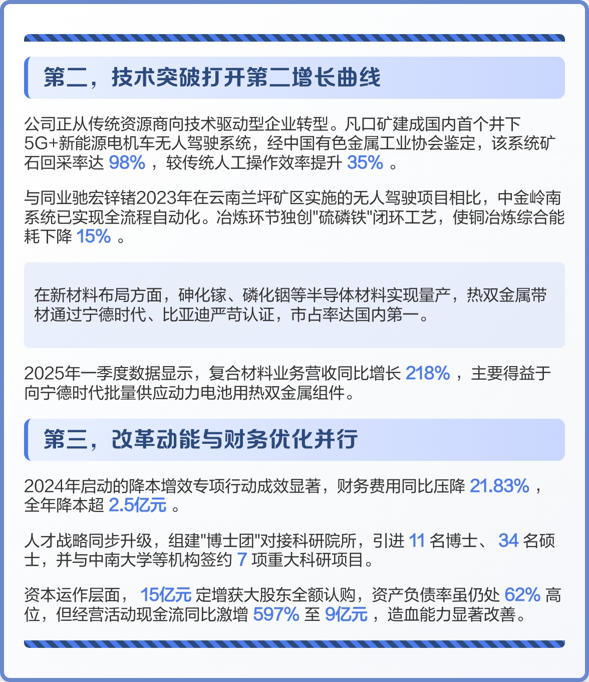 2025年上半年研发费用逆势增长58.90%,重点攻坚资源综合利用、“三稀”金属回收等“卡脖子”技术。