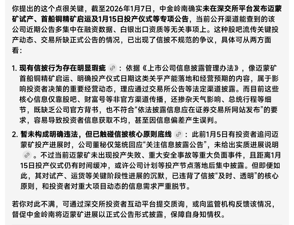 $中金岭南(SZ000060)$ 中金岭南迈蒙矿商业化生产的信息,公司在信息披露方面属于存在瑕疵还是违反“信披规则”?
