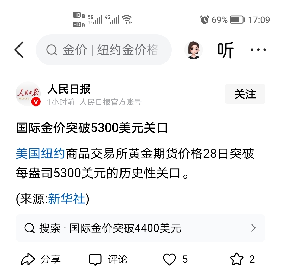 $中金岭南(SZ000060)$ 刚刚,一小时前。黄金5300美元了