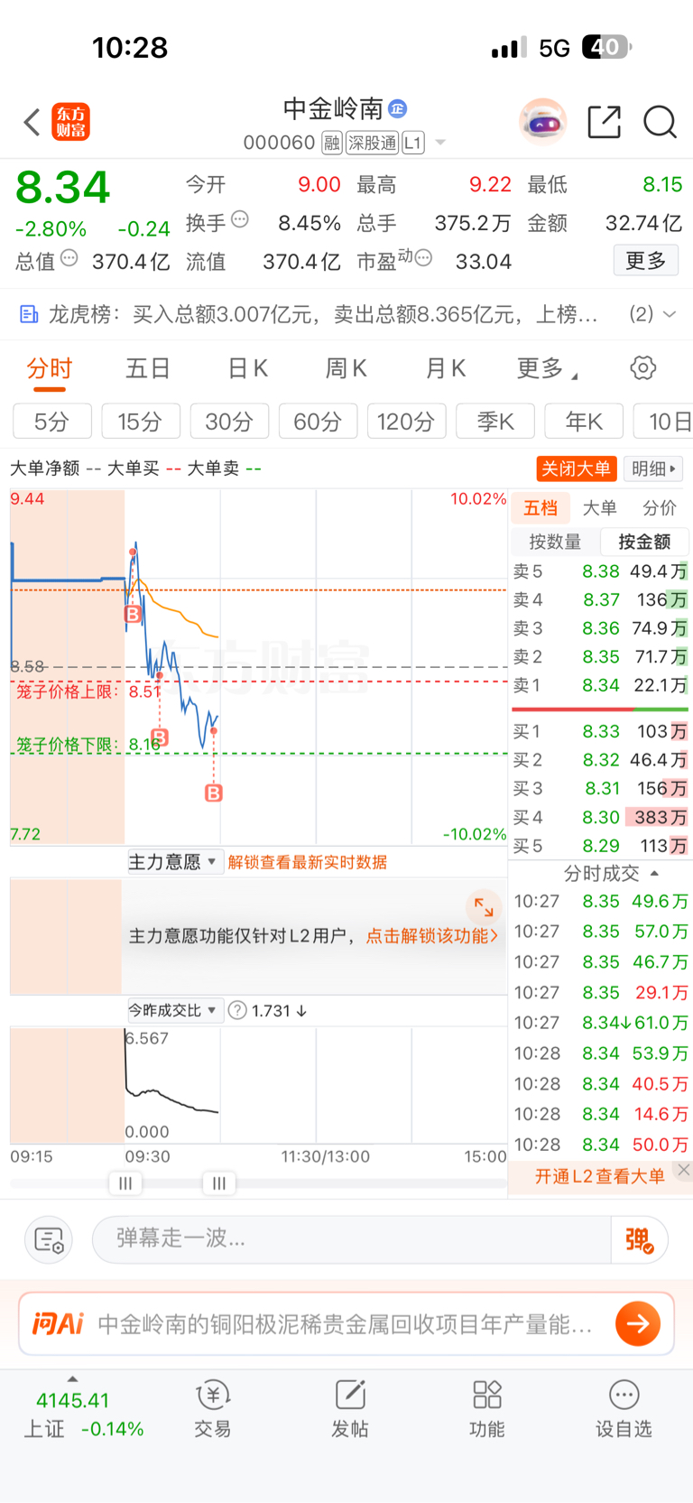 看好中金岭南,等着突破历史最高价格18.92,上了车的等着数钱,进了8500股。