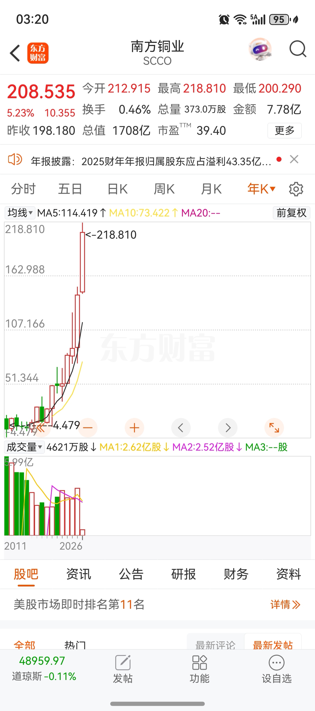 美股南方铜从多年前的4块多美元,涨到218,上周四涨4个多点,周五也才跌8点不像