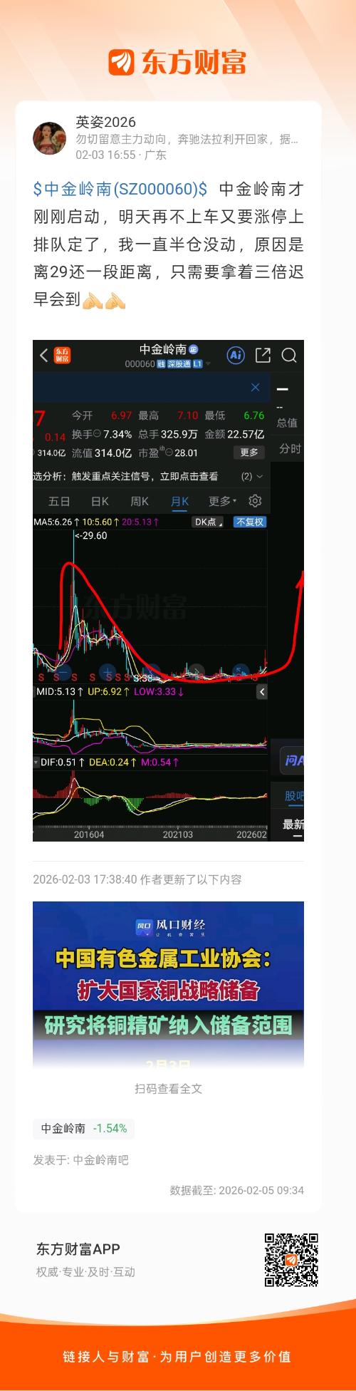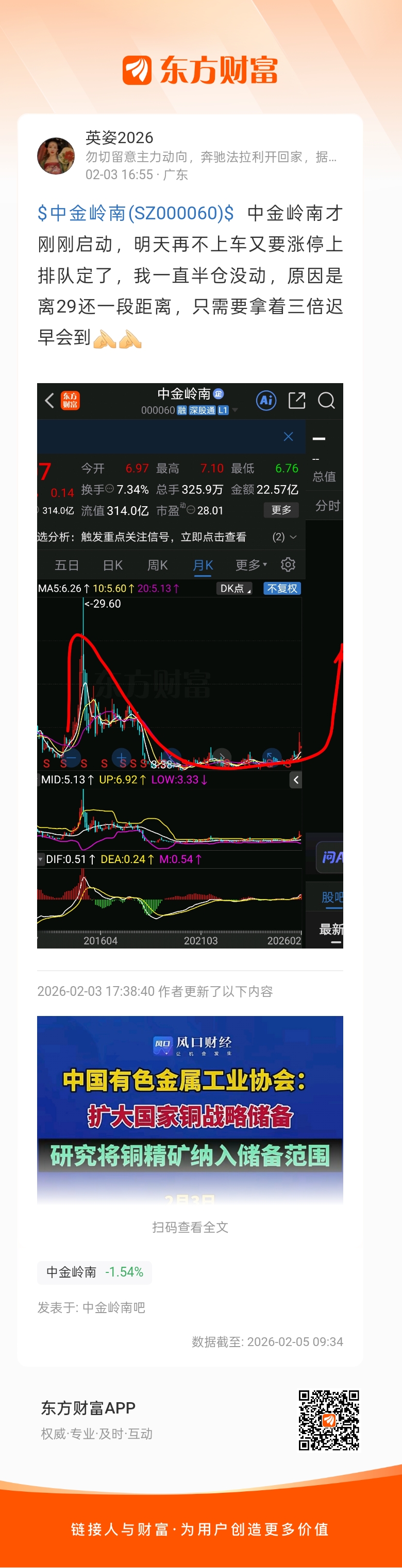 $中金岭南(SZ000060)$ 中金岭南才刚刚启动,明天再不上车又要涨停上排队定了,我一直半仓没动,原因是离29还一段距离,只需要拿着三倍迟早会到