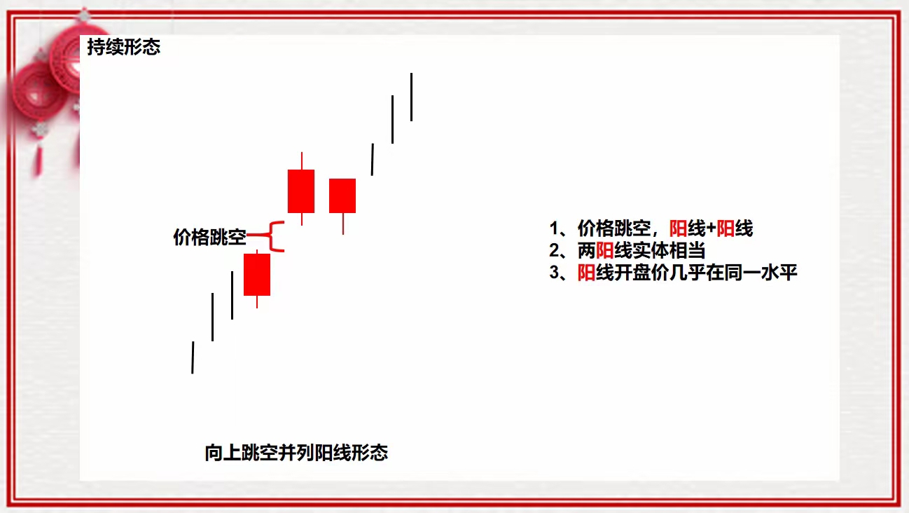 这个形态的本质,是多头的“进攻宣言”:跳空是“强行突破”,并列阳线是“巩固阵地”,两者结合既体现了多头实力,也说明行情没见顶——反而要进入加速阶段。