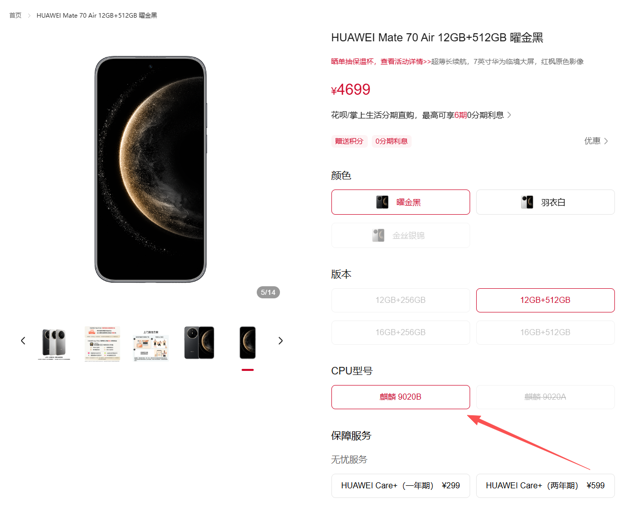 华为手机首次标注芯片型号,华为官网今天新发Mate70Air标注了CPU型号。