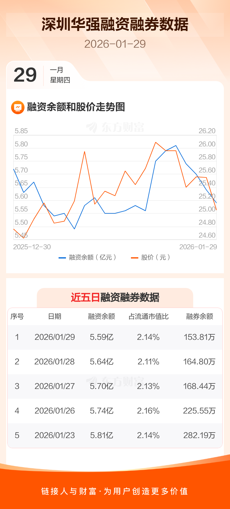 交易所最新数据显示,深圳华强于2026年1月29日获融资买入2145.30万元,融资偿还2594.47万元,当日融资净偿还449.17万元。目前,该股融资余额5.59亿,占流通市值比例为2.14%。