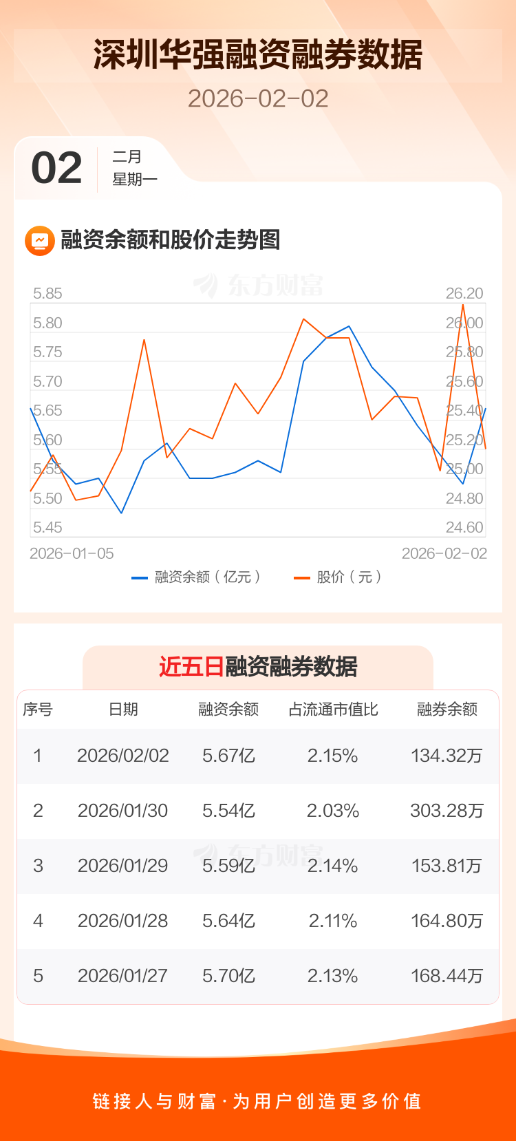 交易所最新数据显示,深圳华强于2026年2月2日获融资买入4522.94万元,融资偿还3227.39万元,当日融资净买入1295.55万元。目前,该股融资余额5.67亿,占流通市值比例为2.15%。