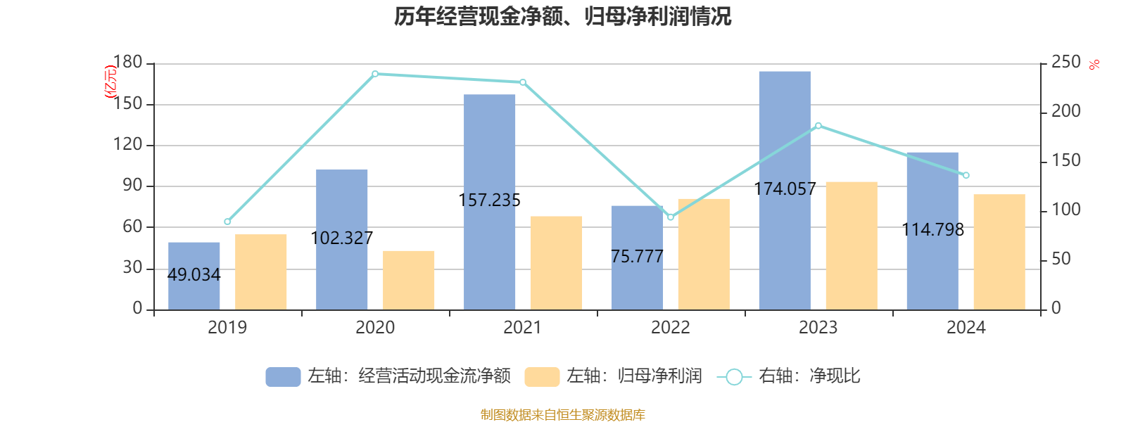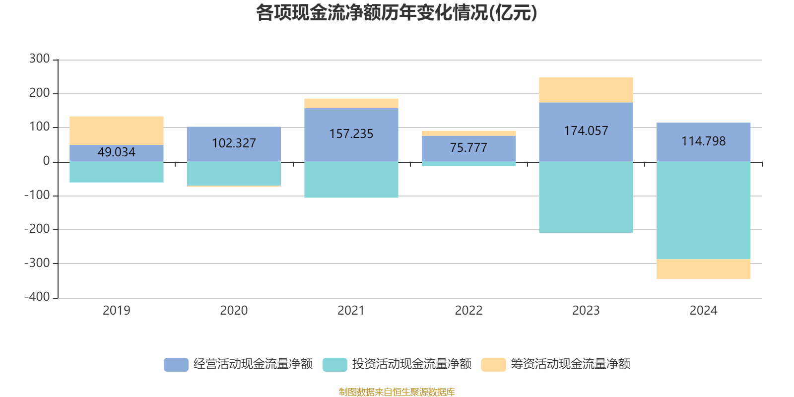 2024年,公司经营活动现金流净额为114.8亿元,同比下降34.05%;筹资活动现金流净额-58.18亿元,同比减少131.9亿元;投资活动现金流净额-286.72亿元,上年同期为-209.01亿元。