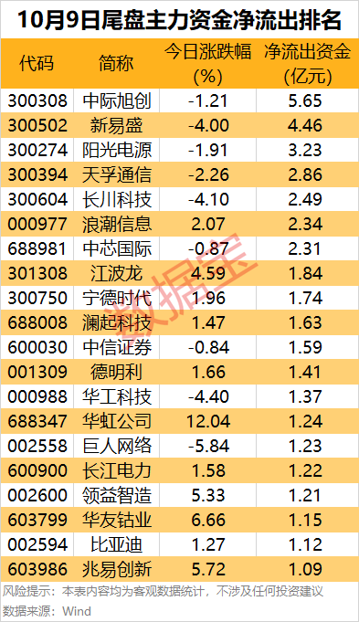 光模块龙头股中际旭创尾盘主力资金净流出5亿元,居首。还有新易盛、阳光电源、天孚通信、长川科技、浪潮信息等尾盘净流出金额居前。