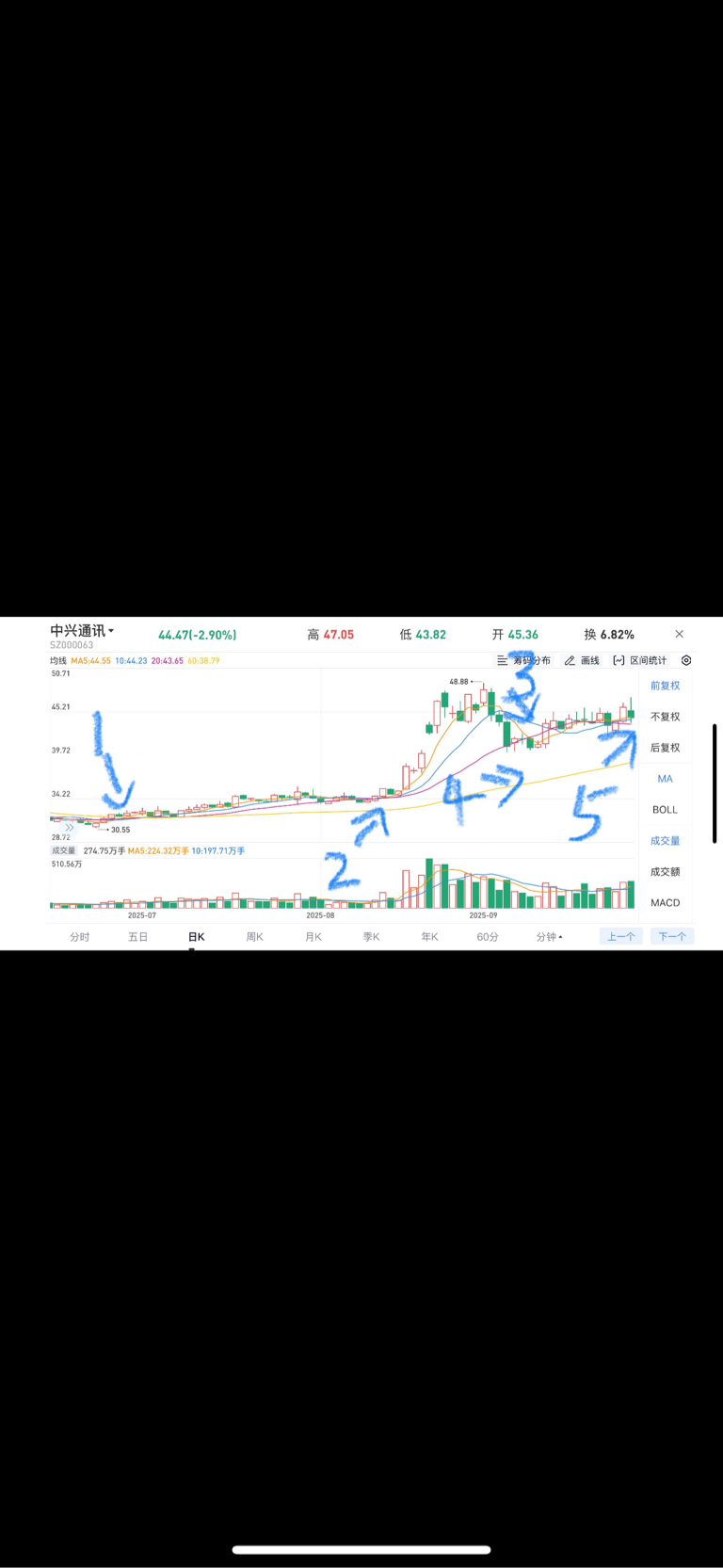 现在是44.47,我们一个月后看中兴是什么样子的吧。