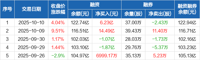 中兴通讯融资融券信息显示,2025年10月10日融资净买入6.23亿元;融资余额122.74亿元,创历史新高,较前一日增加5.35%。