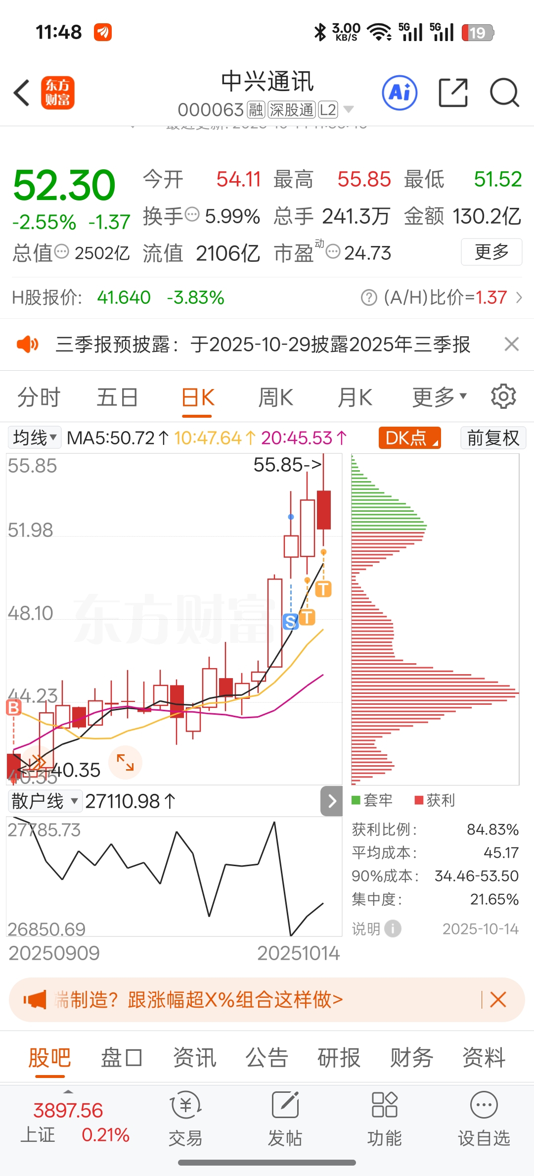 $中兴通讯(SZ000063)$ 这么久,今天第一次栽跟头,做了个倒t,今天属于有点狠了,哎,不过涨了这么多,跌两三个点也行。