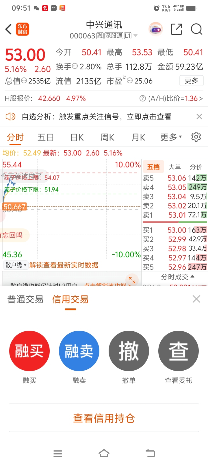 $中兴通讯(SZ000063)$ 无意中触摸上了信用交易,半天卖不出去,吓死我了