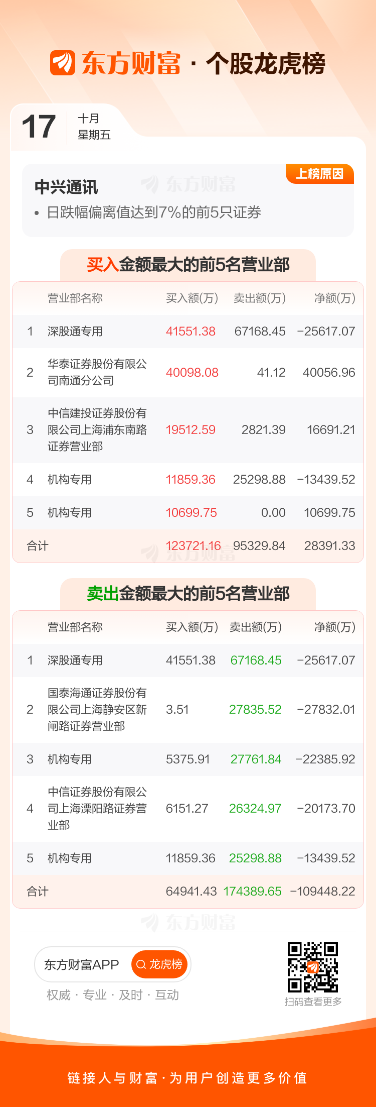 交易所2025年10月17日公布的交易公开信息显示,中兴通讯因成为日跌幅偏离值达到7%的前5只证券上榜。中兴通讯当日收报48.63元,涨跌幅-9.99%,偏离值-7.28%,换手率7.94%,成交额160.78亿。