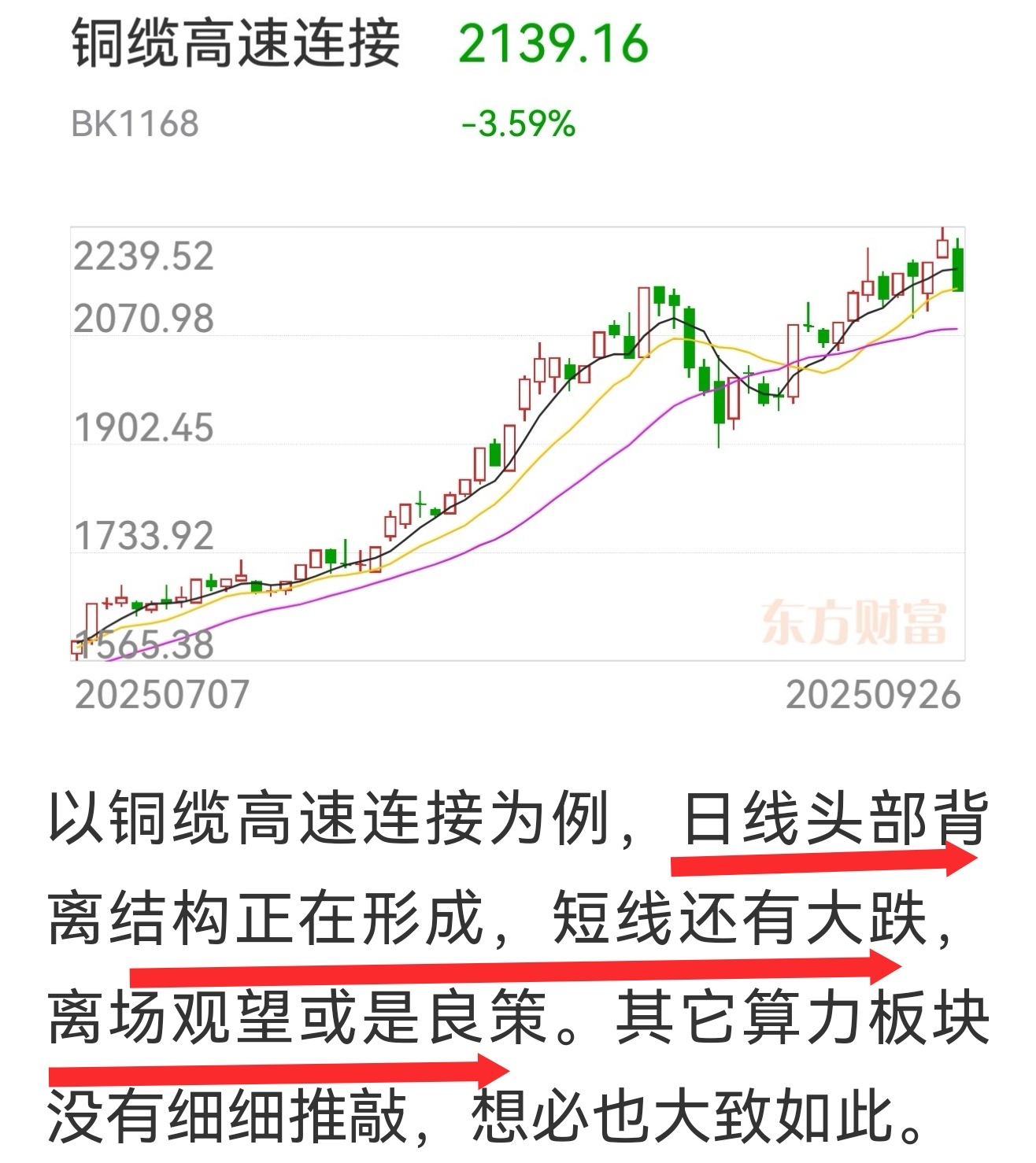 9月26日:以铜缆高速连接为例,日线头部背离结构正在形成,短线还有大跌,离场观望或是良策。其它算力板块没有细细推敲,想必也大致如此。