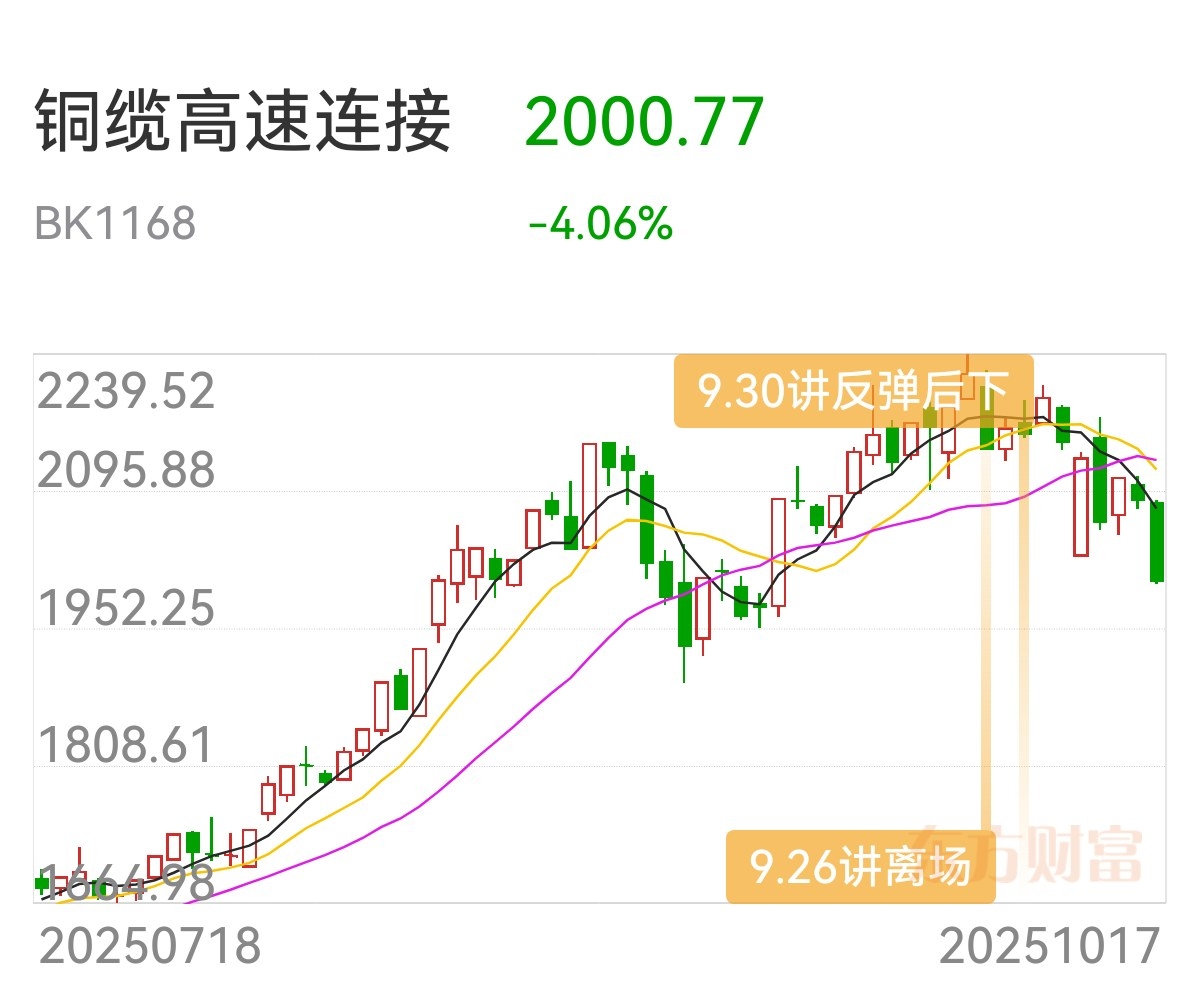 今天回头来看,铜缆高速连接什么时候见顶?从K线图上可以一眼看得出来是9月25号。本ID在9.26号是不是讲要离场观望?