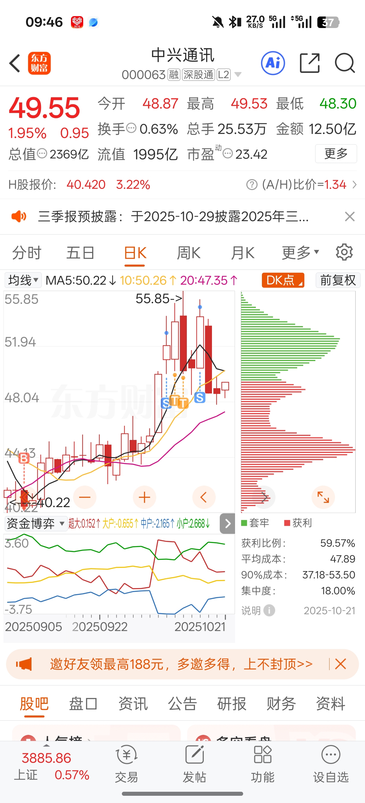 $中兴通讯(SZ000063)$ 那天高点卖了之后,就留了十来万底仓没动了,主要是本很低了,其实我能感觉他肯定会突破我卖的高点,但是我感觉买多了拿不住,就剩下十来个放那也没啥感觉了,