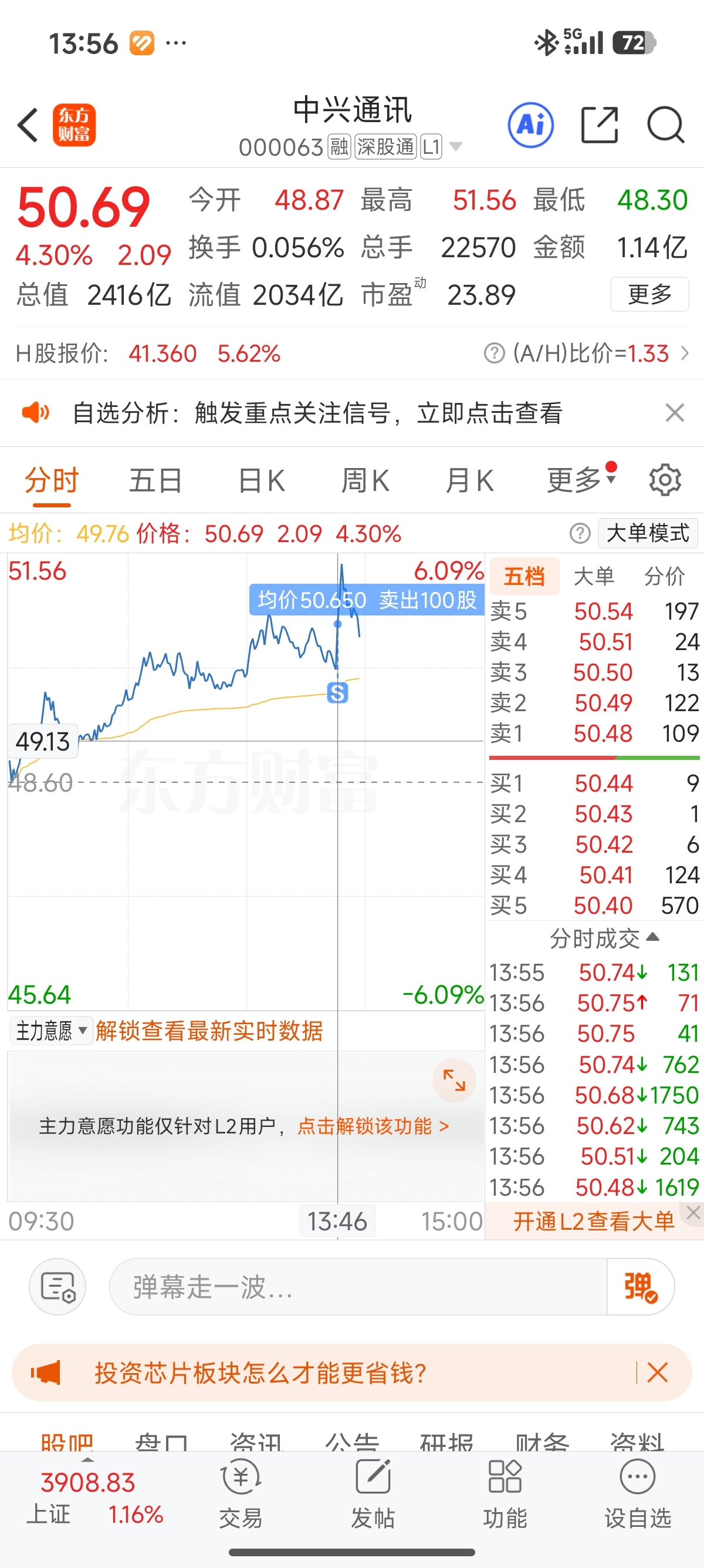 $中兴通讯(SZ000063)$ 50.65咋还卖出了?就赚200元啊
