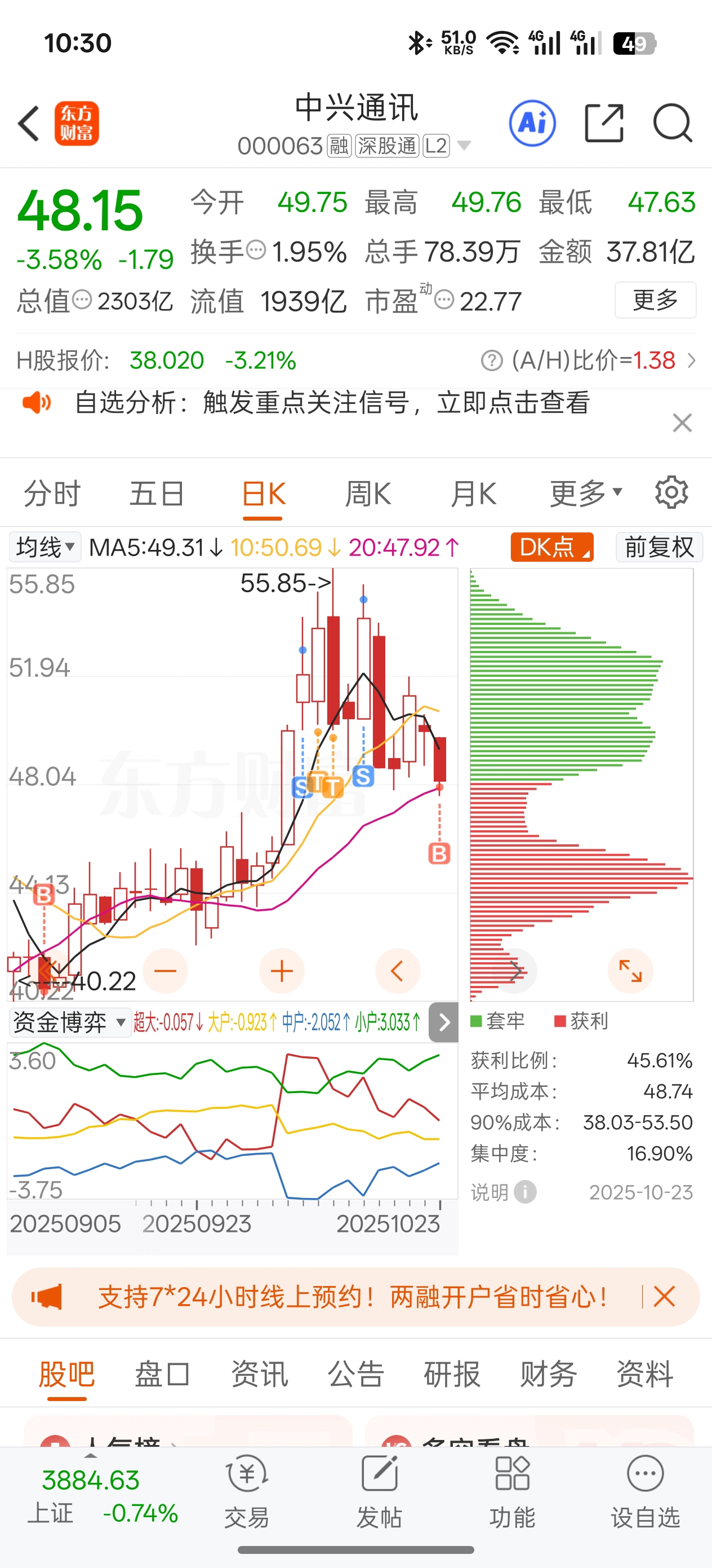 $中兴通讯(SZ000063)$ 今天是我觉得回调完结束的买点,因为这几天在评论底下全是心态崩溃的,散户崩溃了我觉得是买点,20日线挂单买的