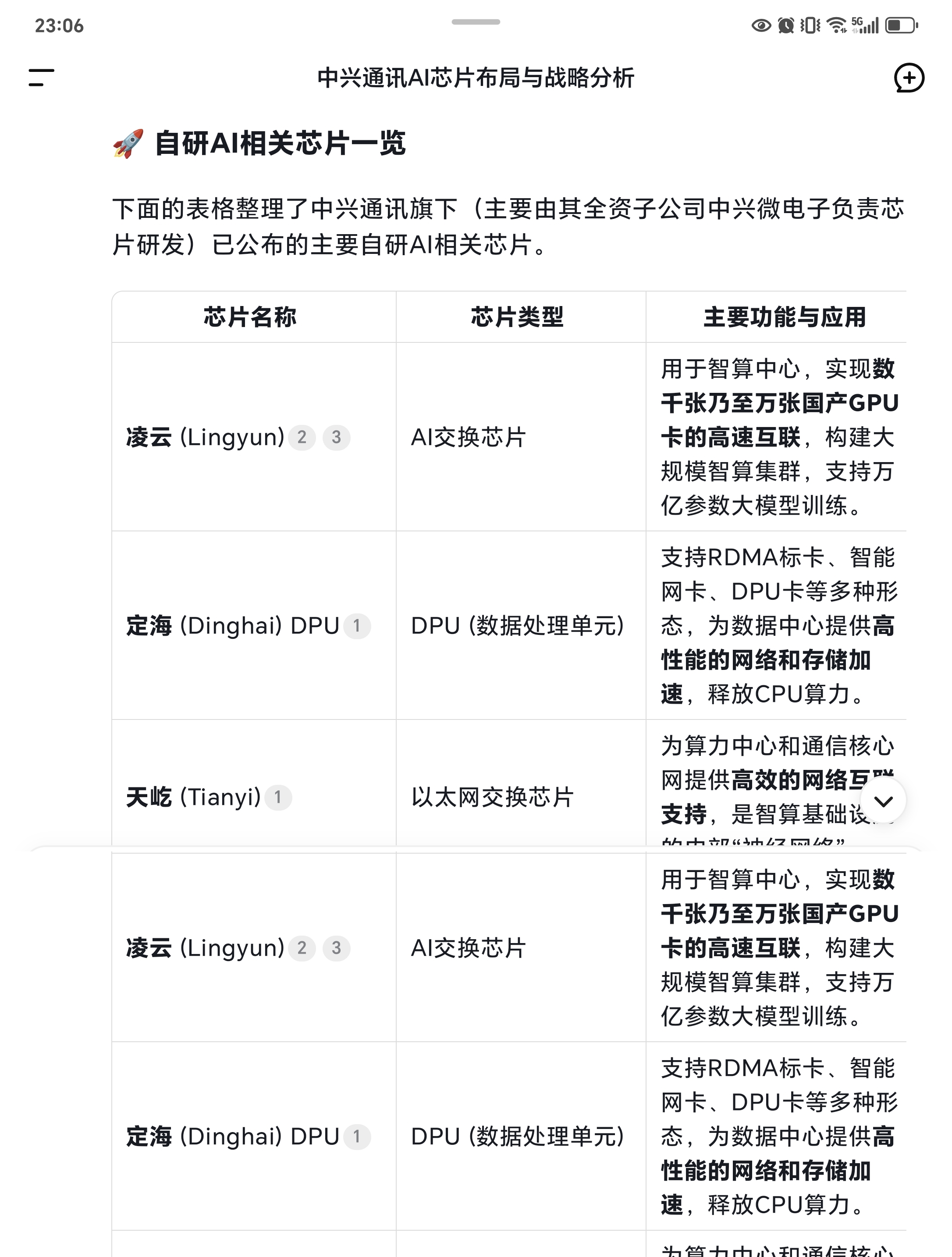 $中兴通讯(SZ000063)$ AI算力芯片是科技发展大方向,中兴有自己的优势产品:
