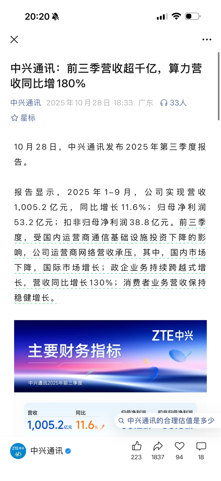 $中兴通讯(SZ000063)$ 我不懂都在唱跌停的原因,这一次行情起来是因为中兴全面向AI转型成功,三季度的财报证明,AI算力业务继续狂飙!