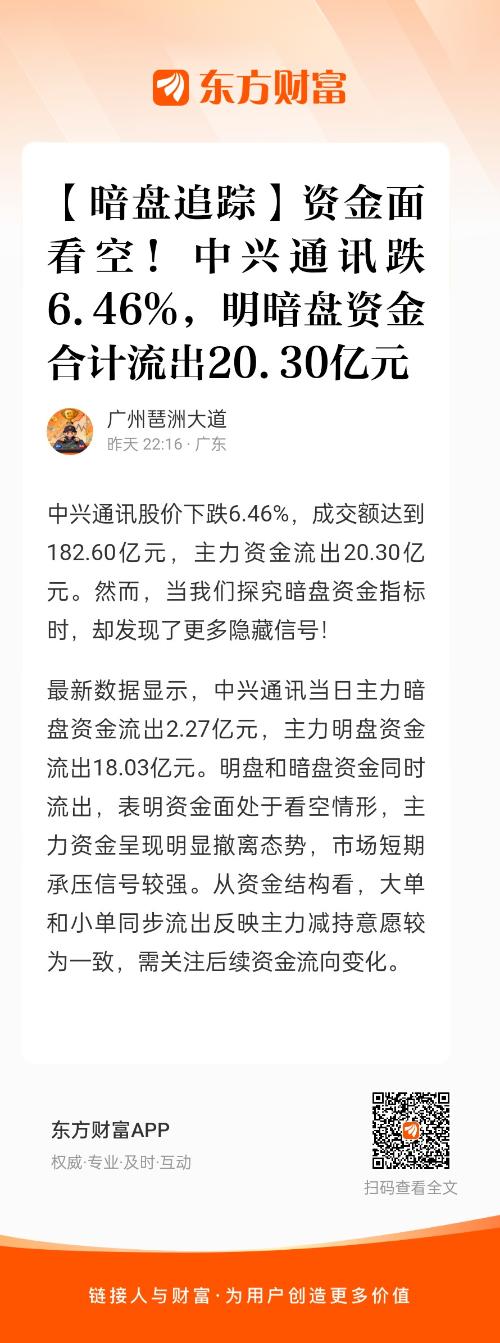 中兴通讯股价下跌6.46%,成交额达到182.60亿元,主力资金流出20.30亿元。然而,当我们探究暗盘资金指标时,却发现了更多隐藏信号!