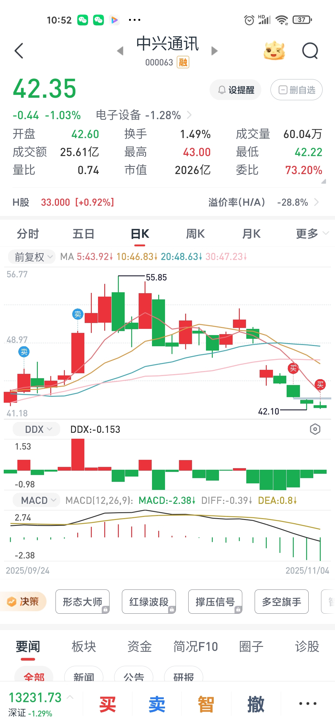 $中兴通讯(SZ000063)$ 六连跌了,今天追加仓后,成本是43.2元,看多久能解套,不解套不割肉