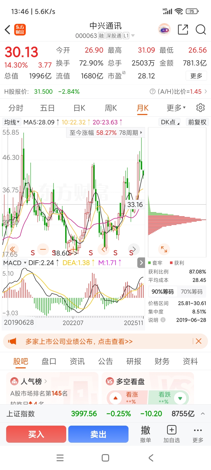 $中兴通讯(SZ000063)$ 跌到30会有止跌反调一波上涨!!!