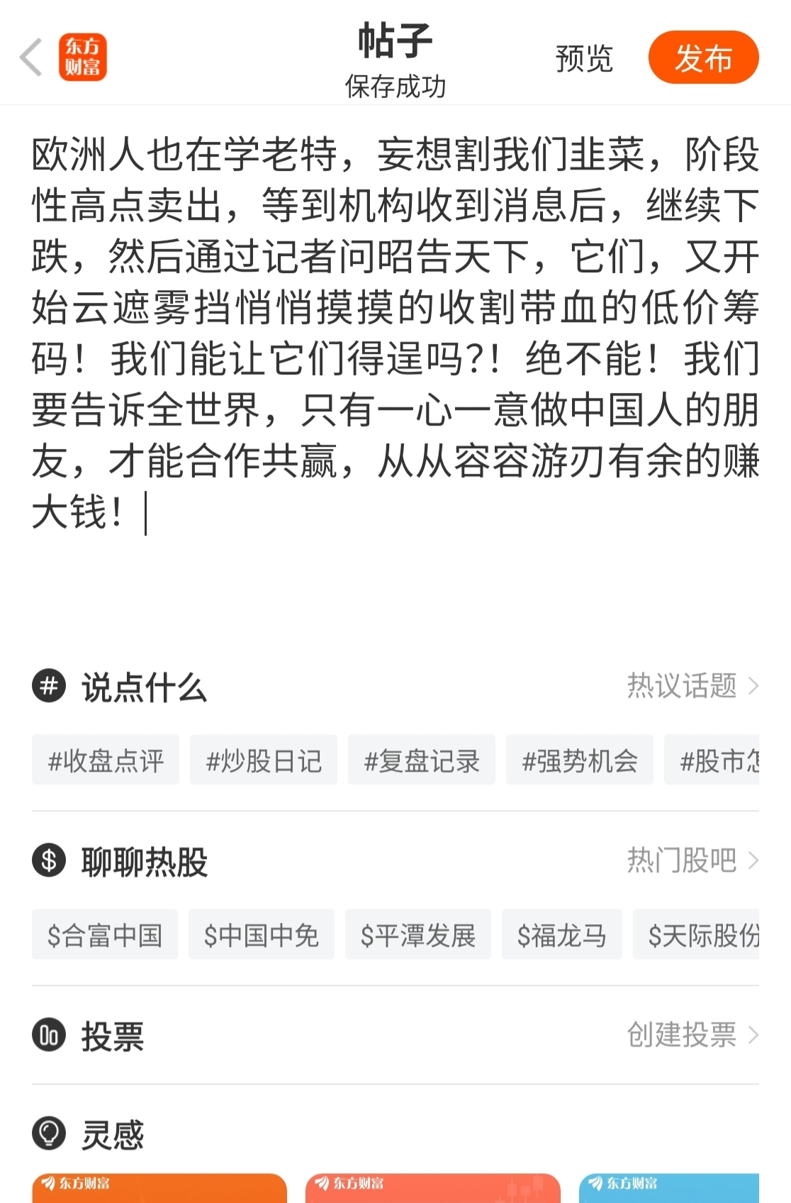 温馨提示: 1.根据《证券法》规定,禁止编造、传播虚假信息或者误导性信息,扰乱证券市场;2.用户在本社区发表的所有资料、言论等仅代表个人观点,与本网站立场无关,不对您构成任何投资建议。用户应基于自己的独立判断,自行决定证券投资并承担相应风险。《东方财富社区管理规定》