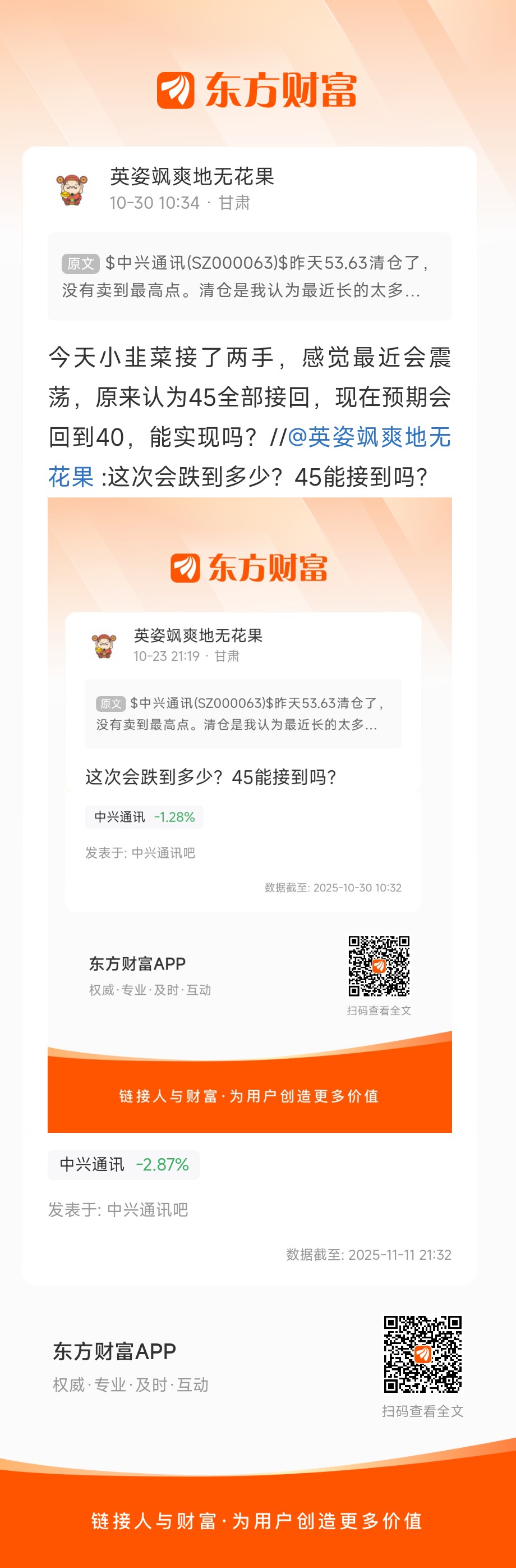$中兴通讯(SZ000063)$ 昨天53.63清仓了,没有卖到最高点。清仓是我认为最近长的太多了,并不是不看好中兴的未来,今天跌停想接回,忍住了,大家认为中兴会跌到多少止跌?还是周一反包向上?