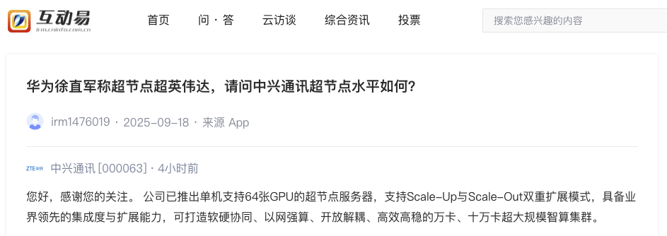 11月13日,中兴通讯在互动平台表示,公司已推出单机支持64张GPU的超节点服务器,支持Scale-Up与Scale-Out双重扩展模式,具备业界领先的集成度与扩展能力,可打造软硬协同、以网强算、开放解耦、高效高稳的万卡、十万卡超大规模智算集群。